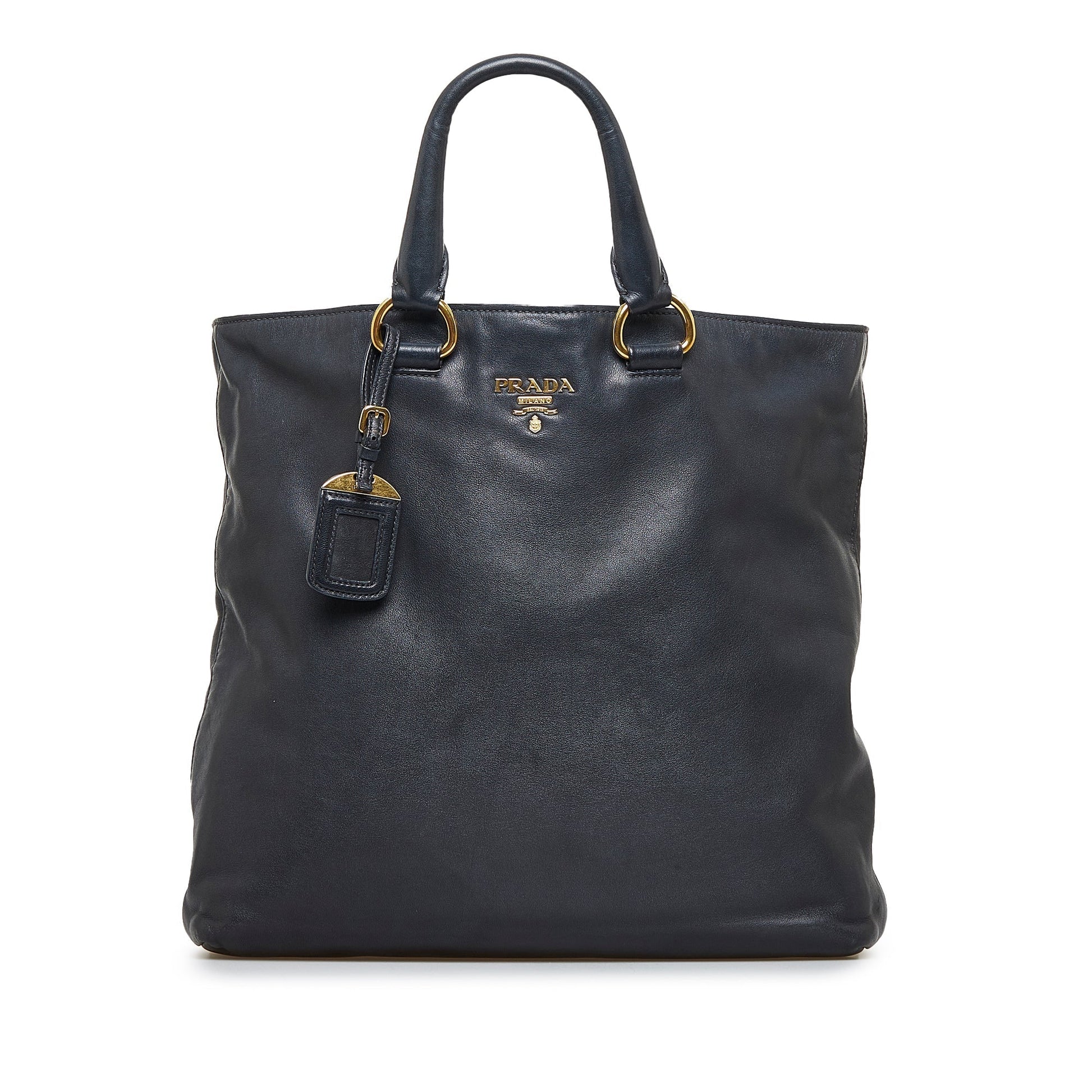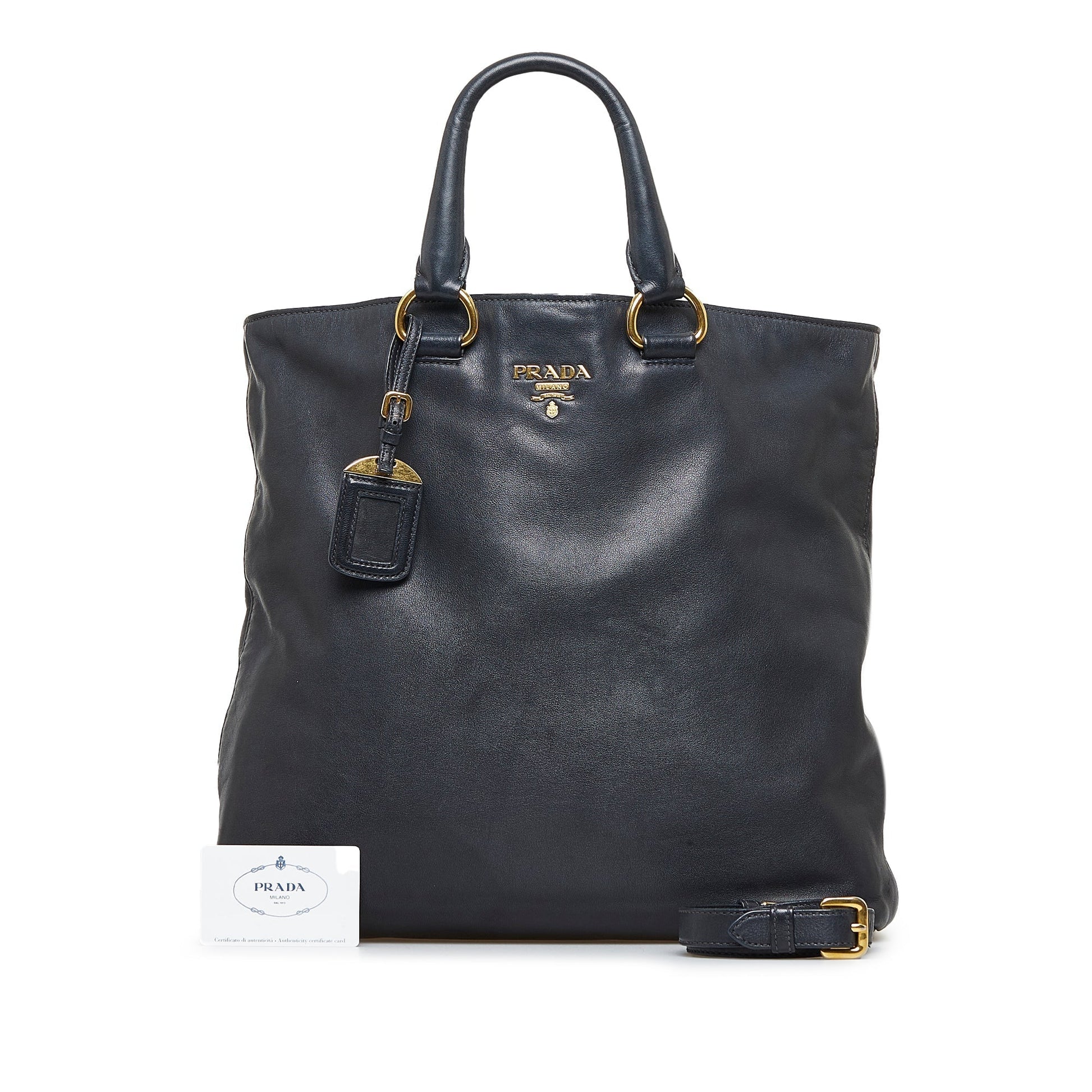 Product Details: Black Prada Soft Calf Shopping Tote Satchel. This satchel features a leather body, rolled leather handles, a detachable flat leather strap, an open top with magnetic closure, and interior zip and slip pockets. 13.4" L x 14" W x 4.5" D, 5.1" drop. Serial number -.