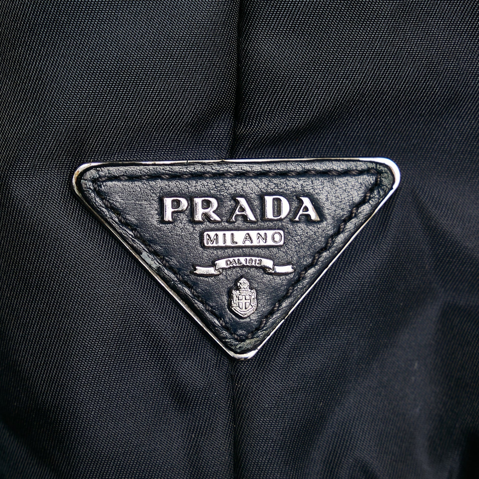 Product Details: Blue Prada Tessuto Reversible Tote Bag. This tote bag features a nylon body, an exterior front zip pocket, rolled handles, a detachable flat shoulder strap, an open top, and an interior zip pocket. 16.7" L x 13.8" W x 7.1" D.
