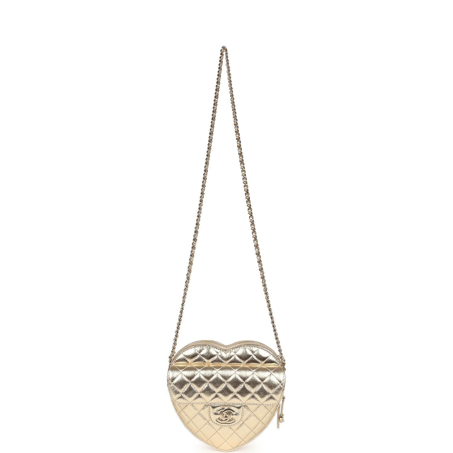 This Large CC In Love Heart Bag with Chain is in gold metallic lambskin leather with light gold tone hardware and features a front flap with signature CC turnlock closure, half moon back pocket, zip top closure and an interwoven light gold tone chainlink and Gold leather shoulder strap.