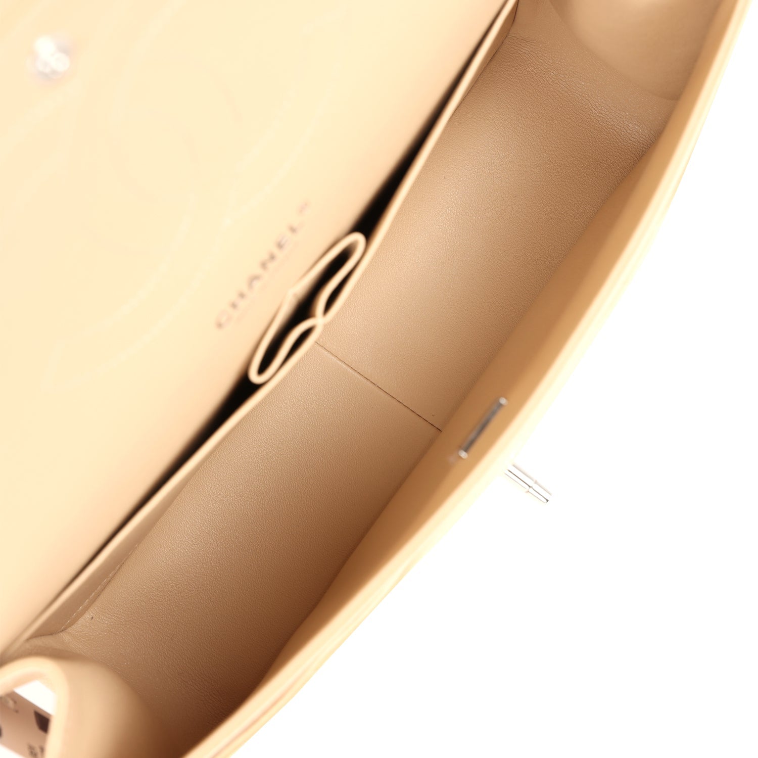 This Jumbo Classic Double Flap bag is in light beige caviar leather with silver tone hardware and features a front flap with signature CC turnlock closure, half moon back pocket, and adjustable interwoven silver tone chain link and beige leather shoulder strap.