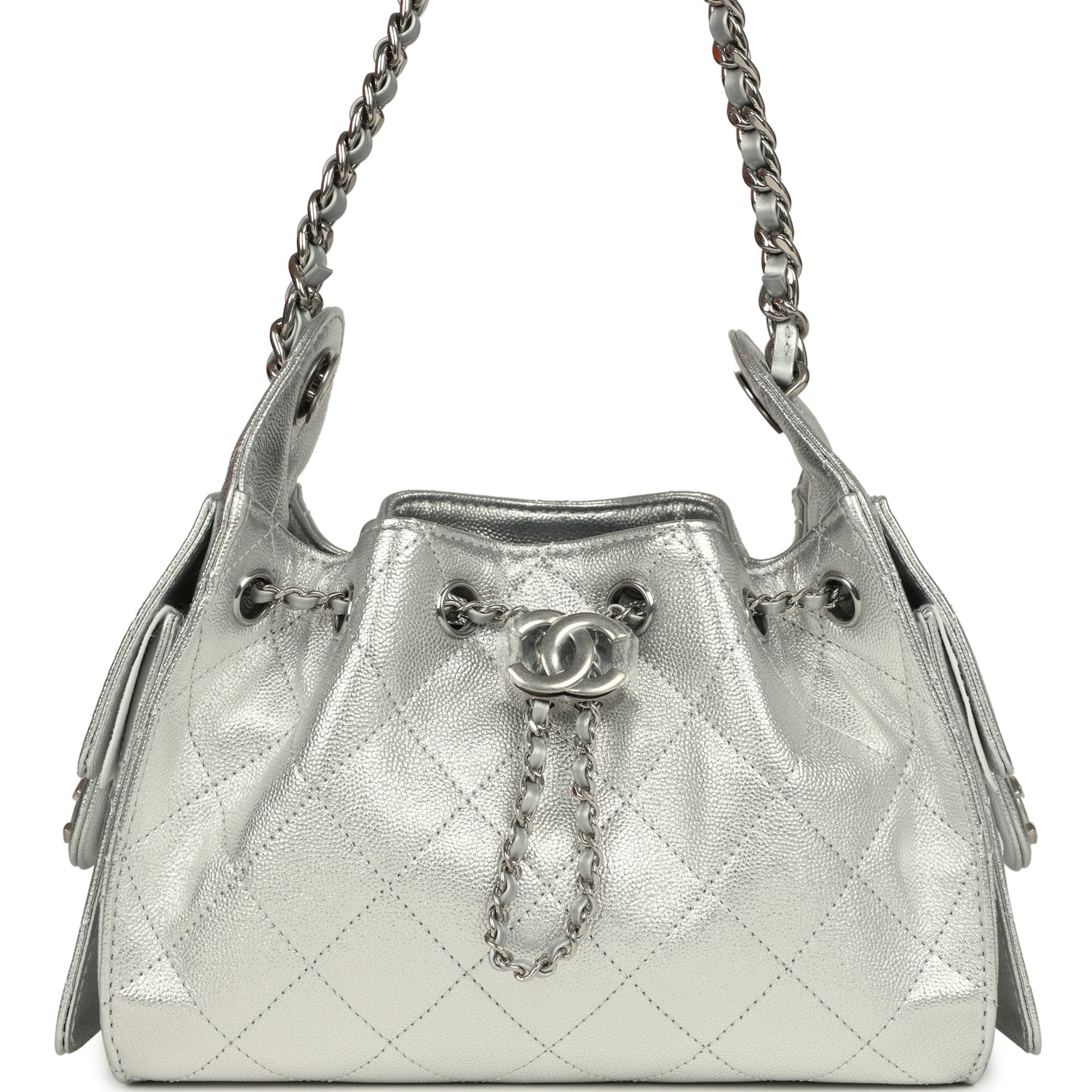 This Chanel Mini 25 Hobo Bag is in metallic silver caviar leather with silver hardware, features signature diamond quilt, two exterior side pockets, drawstring closure, and a single interwoven silver tone and metallic silver leather shoulder strap.