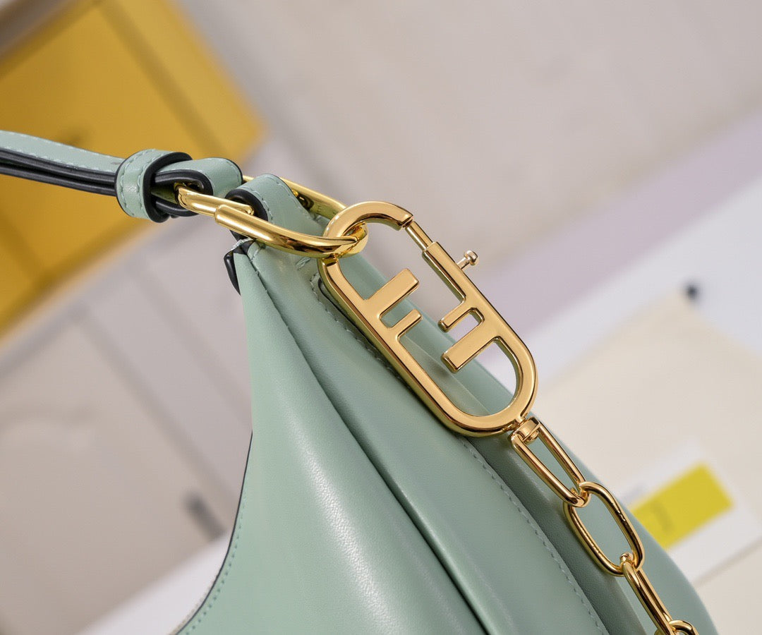 Small hobo bag made of soft, blue leather, decorated with vintage gold metal FENDI lettering visible when wearing the bag under the arm.
