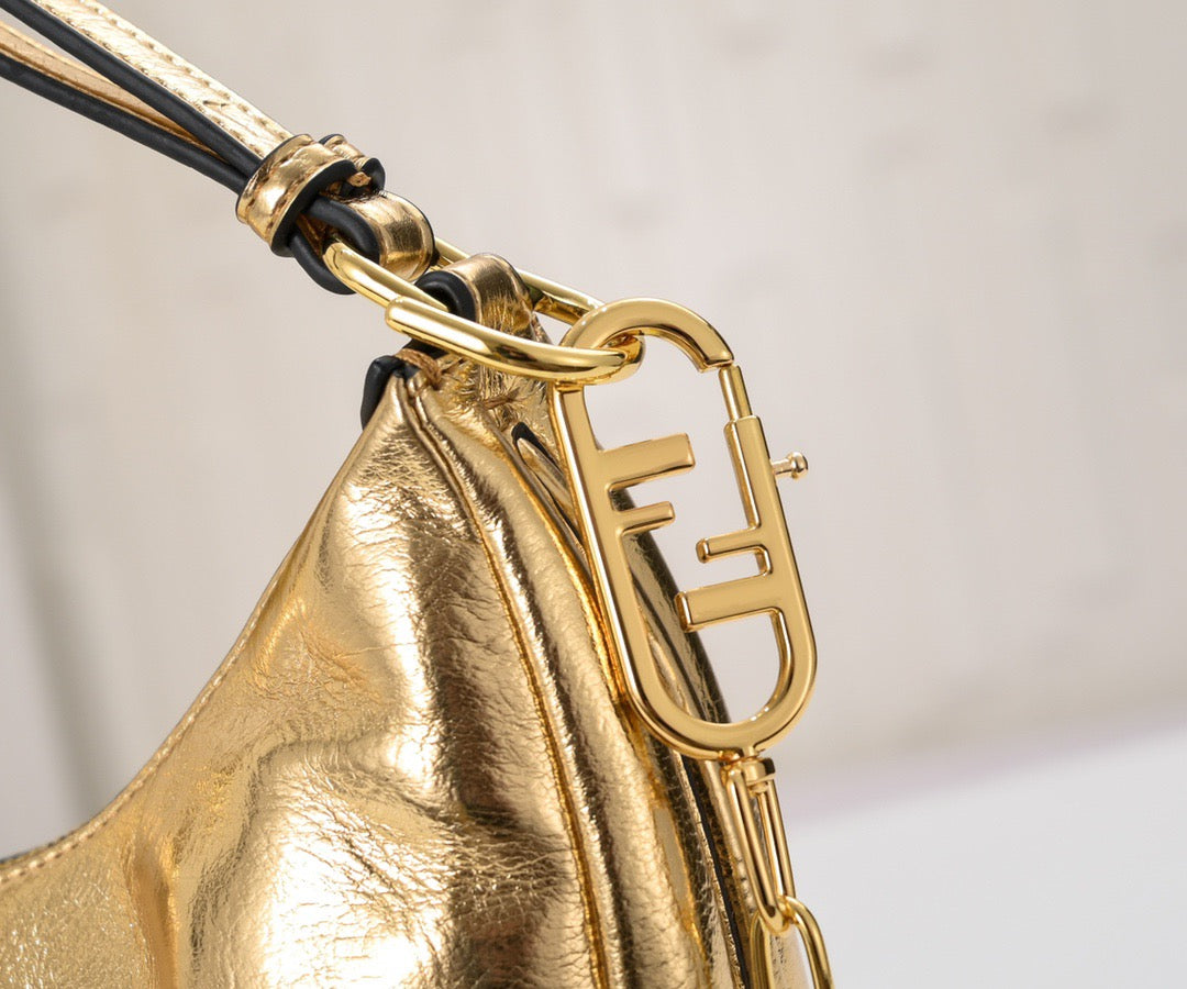 Small hobo bag made of soft, blue leather, decorated with vintage gold metal FENDI lettering visible when wearing the bag under the arm.