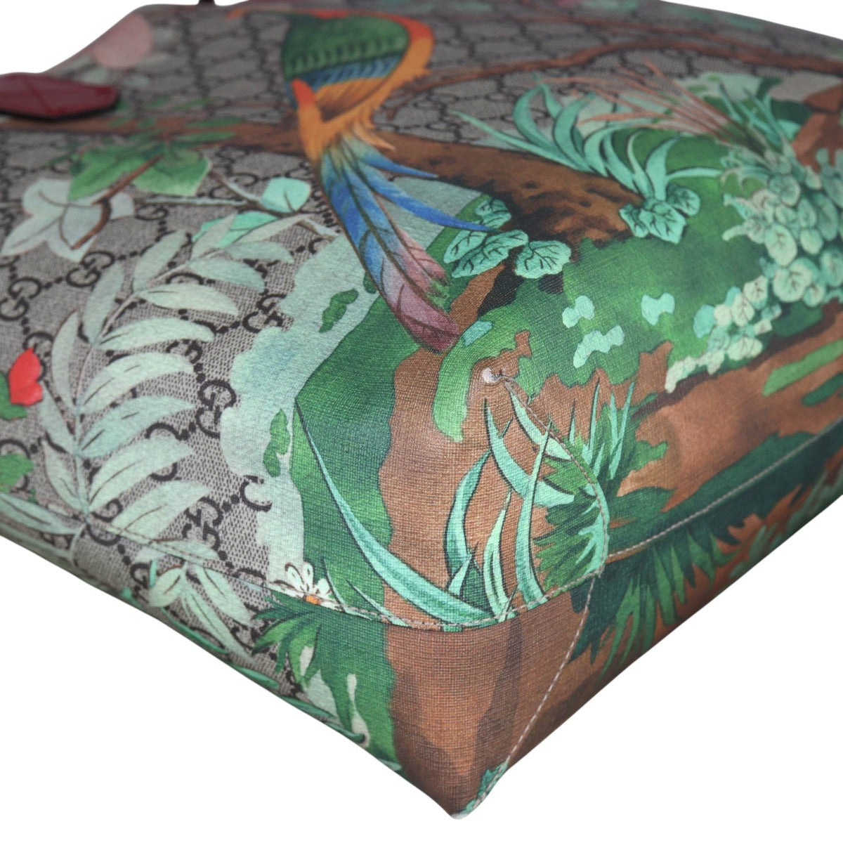 Colour/Material: GG supreme coated canvas exterior with bird and foliage print; deep red leather trim.