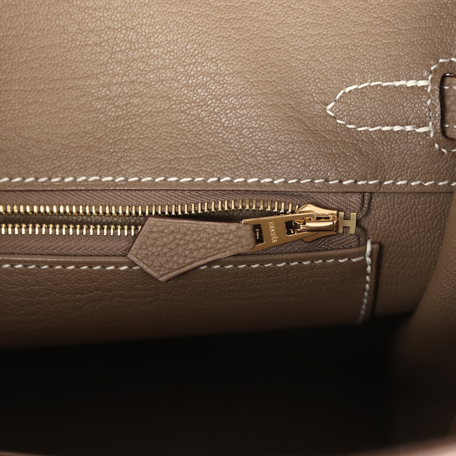 The interior is lined with Etoupe chevre and has one zip pocket with an Hermes engraved zipper pull and an open pocket on the opposite side.