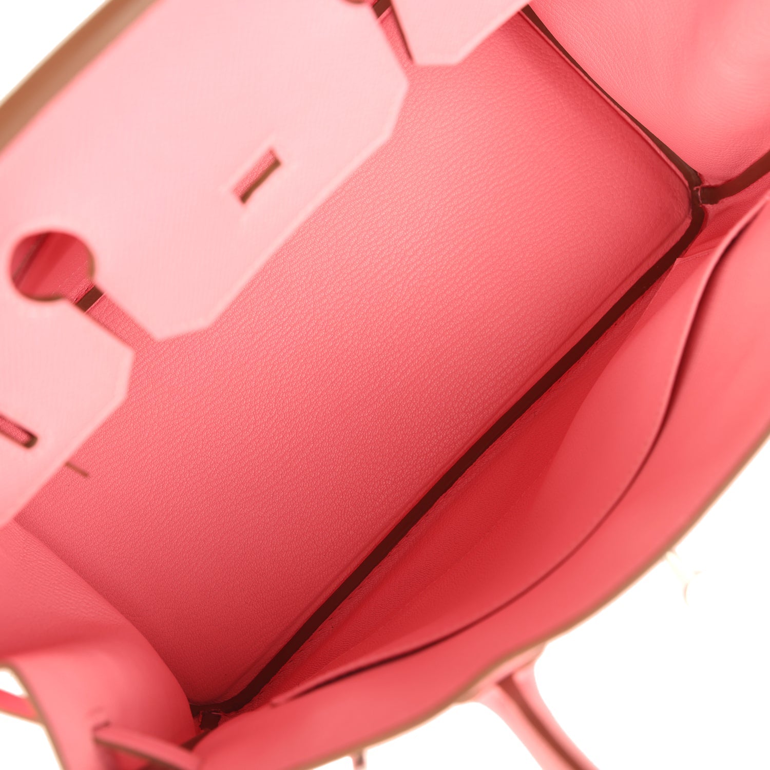 This Birkin is in Rose Confetti epsom leather with palladium hardware and has tonal stitching, a front toggle closure, a clochette with lock and two keys, and double rolled handles.