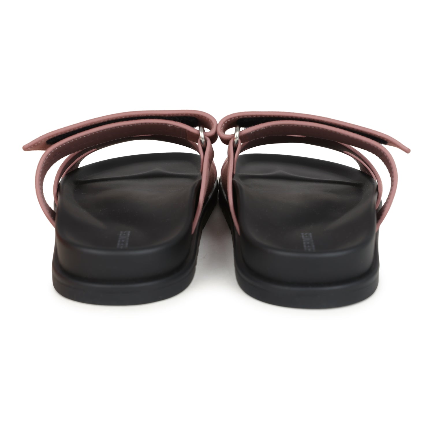 This pair of Hermes Chypre Techno sandals are in Rose Antique suede leather with black rubber soles, adjustable straps and palladium hardware in a size 38 EU.