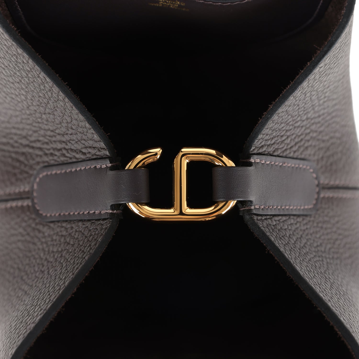 This In-The-Loop is in Ebene clemence and swift leather with gold hardware, bucket shaped bag with tonal stitching, two Chaine d'Ancre shaped handles, single interior pocket, Chaine d'Ancre shaped hook closure.