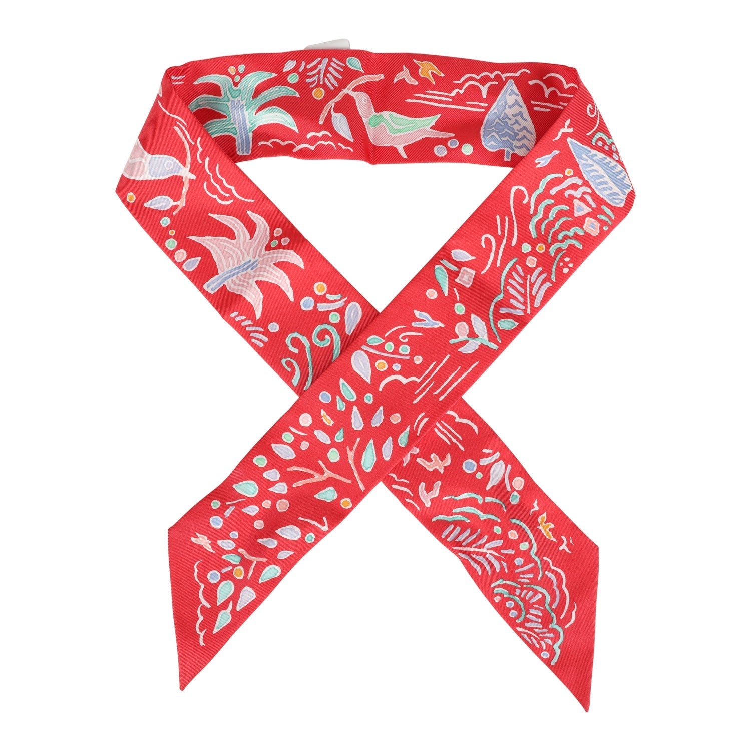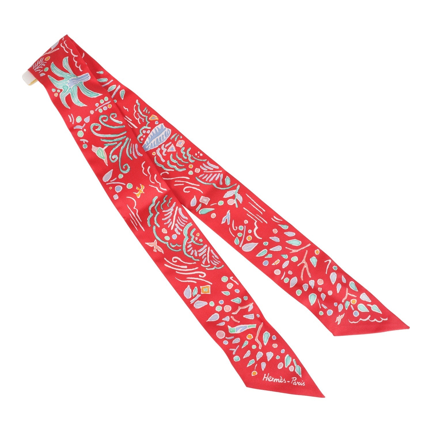 This Hermes "Isola Di Primavera" silk twilly pair is of Vert, Bleu and Grenadine, designed by Matthieu Cossé, in a red multi colorway.