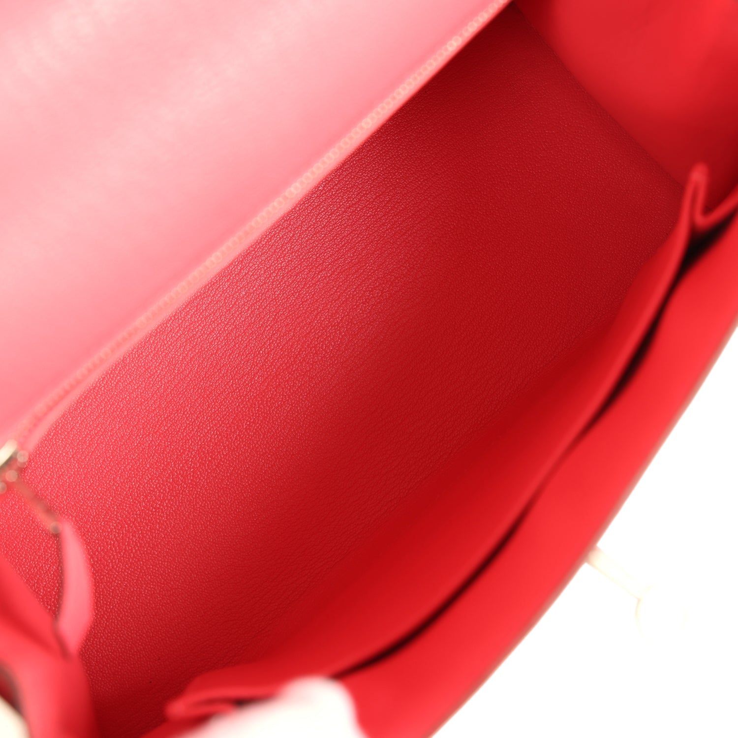 The interior is lined in Rose Lipstick chevre leather and has one zip pocket with Hermes engraved pull; pocket on opposite side