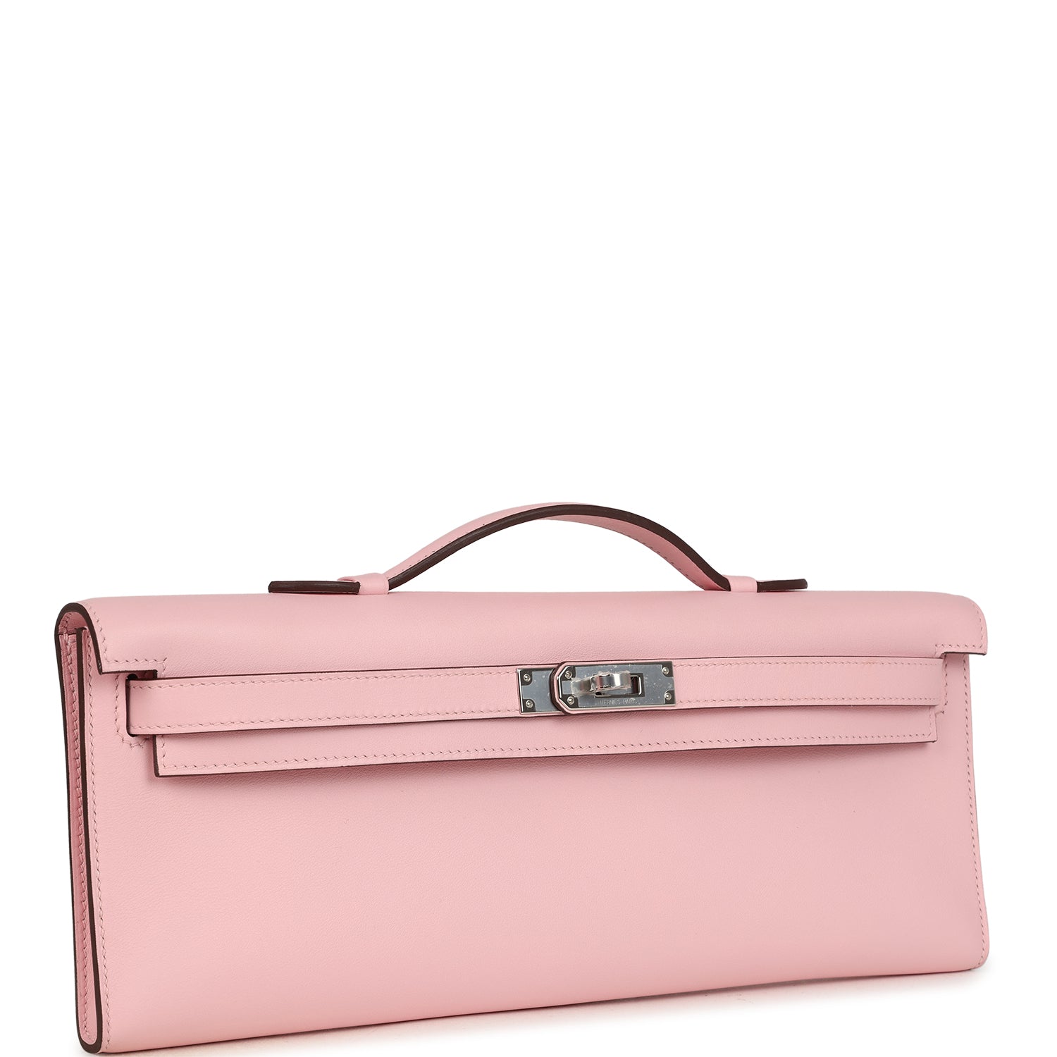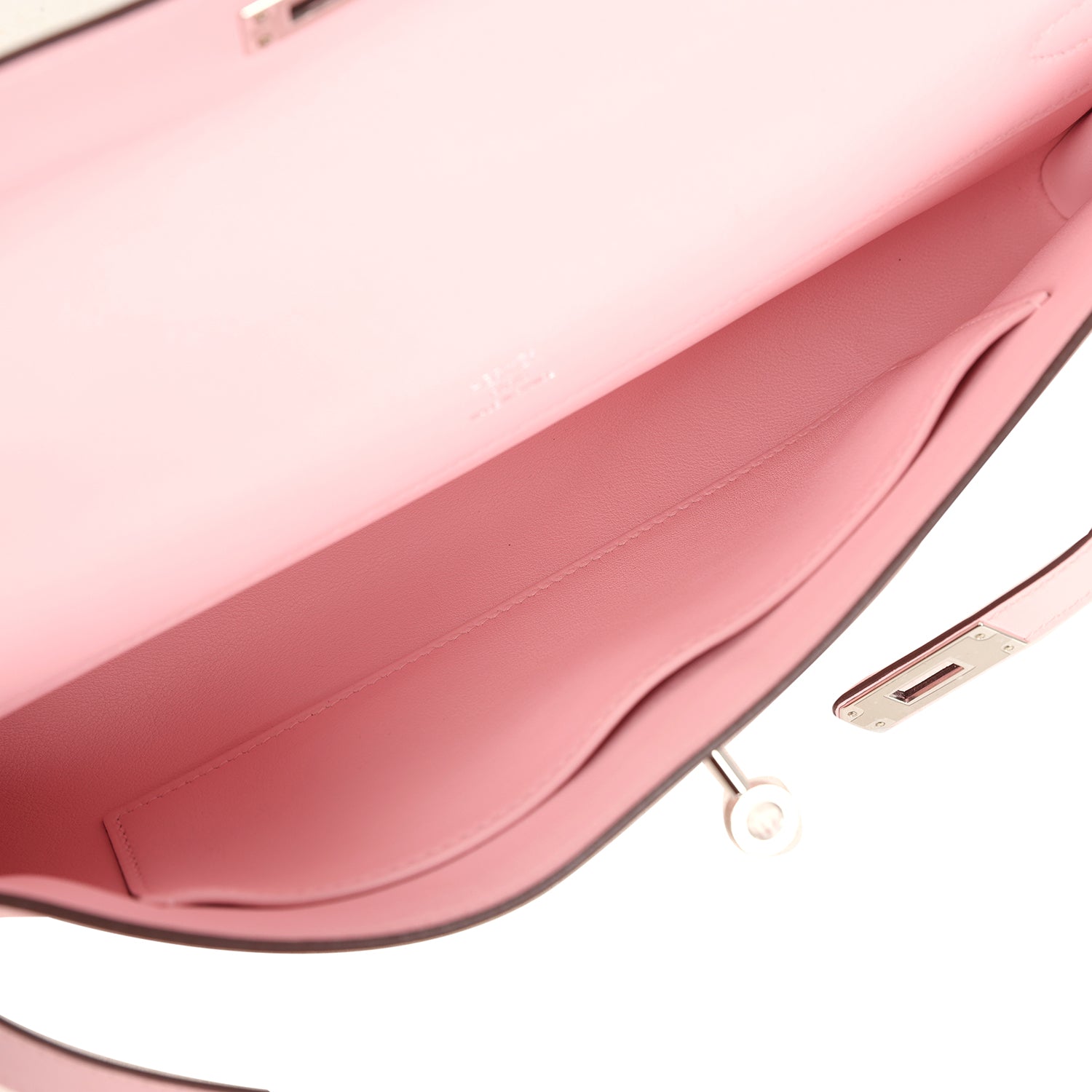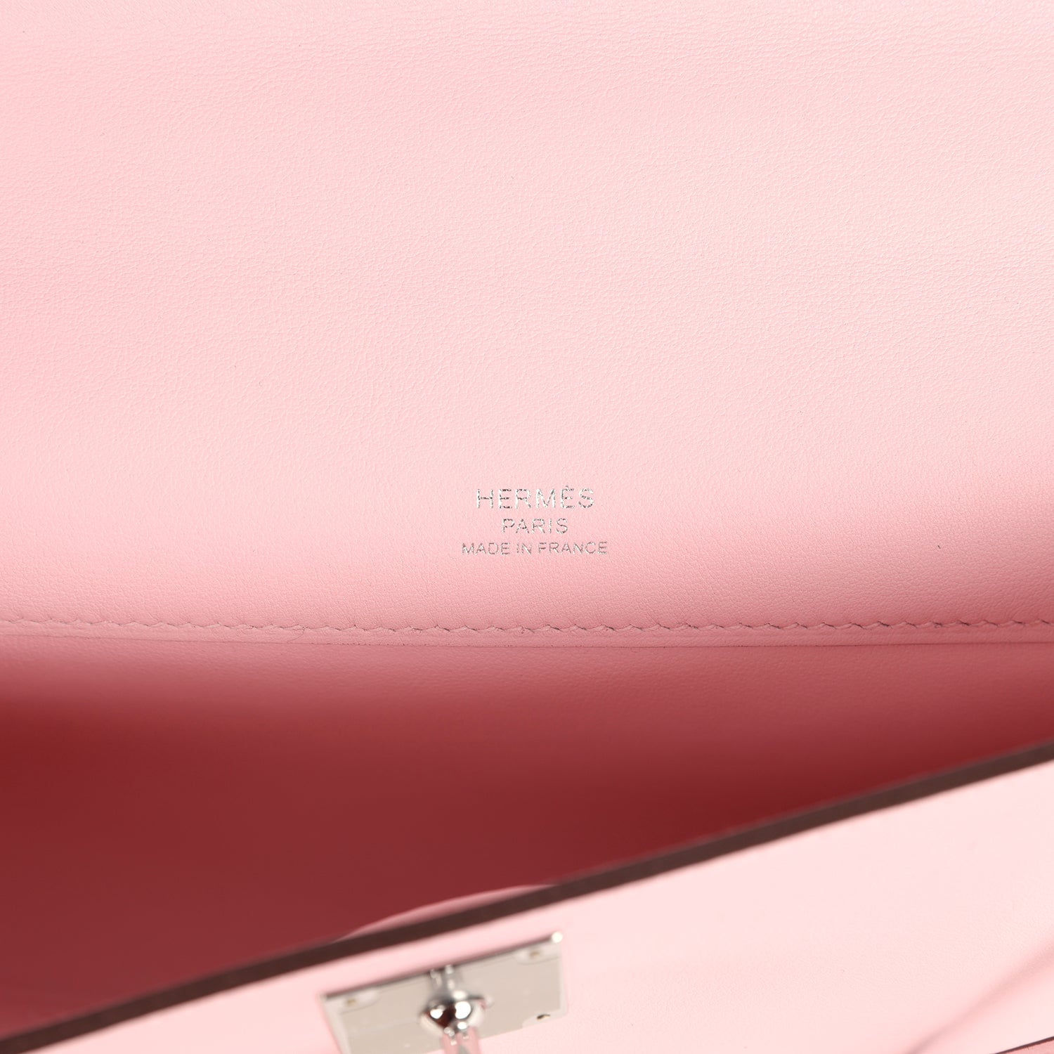 The interior is lined in Rose Sakura swift leather and has one interior slit pocket on front wall.