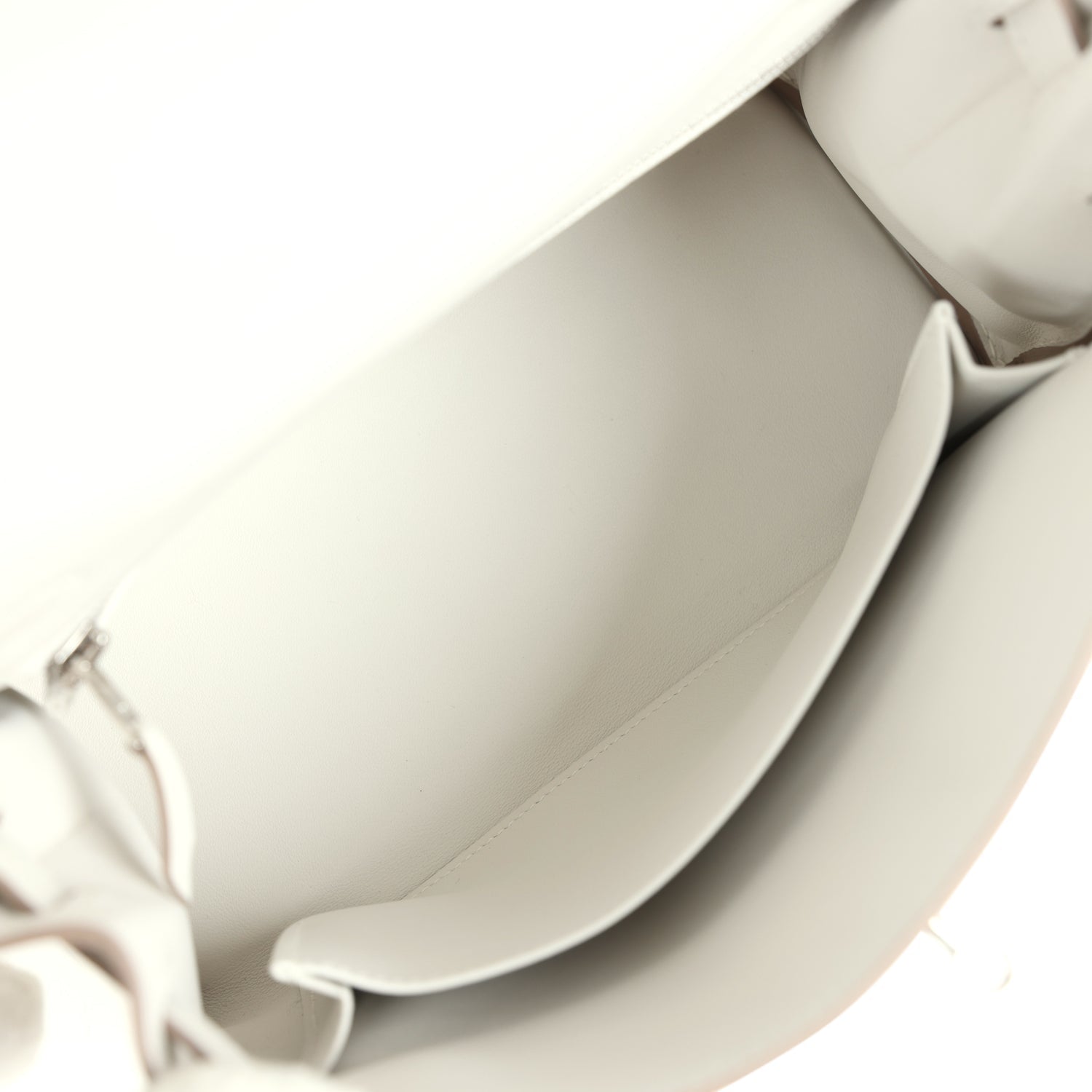 The interior is lined with Gris Pale Swift leather and has one zip pocket with an Hermes engraved pull and one open pocket on the opposite side.