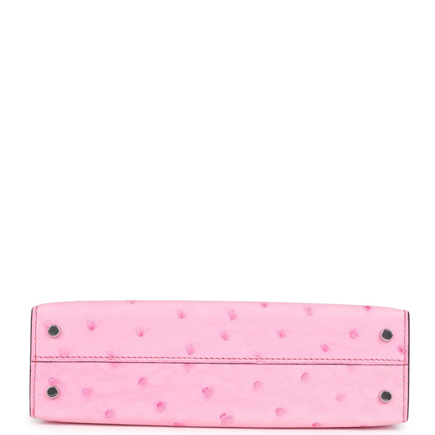 This Kelly, in the Sellier style, is in Bubblegum ostrich leather with palladium hardware and has tonal stitching, two front straps with front toggle closure, single rolled handle and removable shoulder strap.
