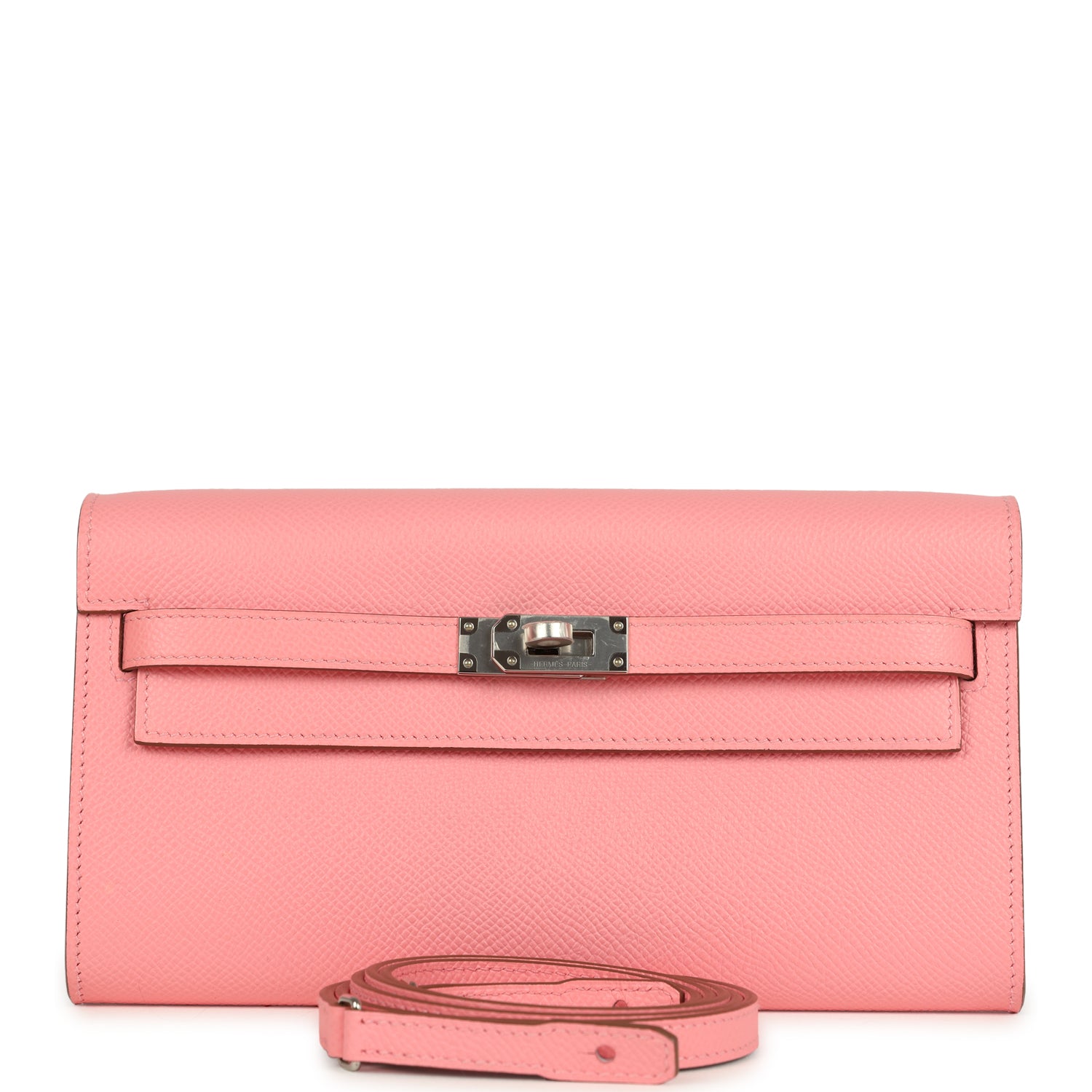 This Kelly Wallet To Go is in Rose Confetti epsom leather with palladium hardware and has tonal stitching, two straps with front toggle closure and removable crossbody strap.