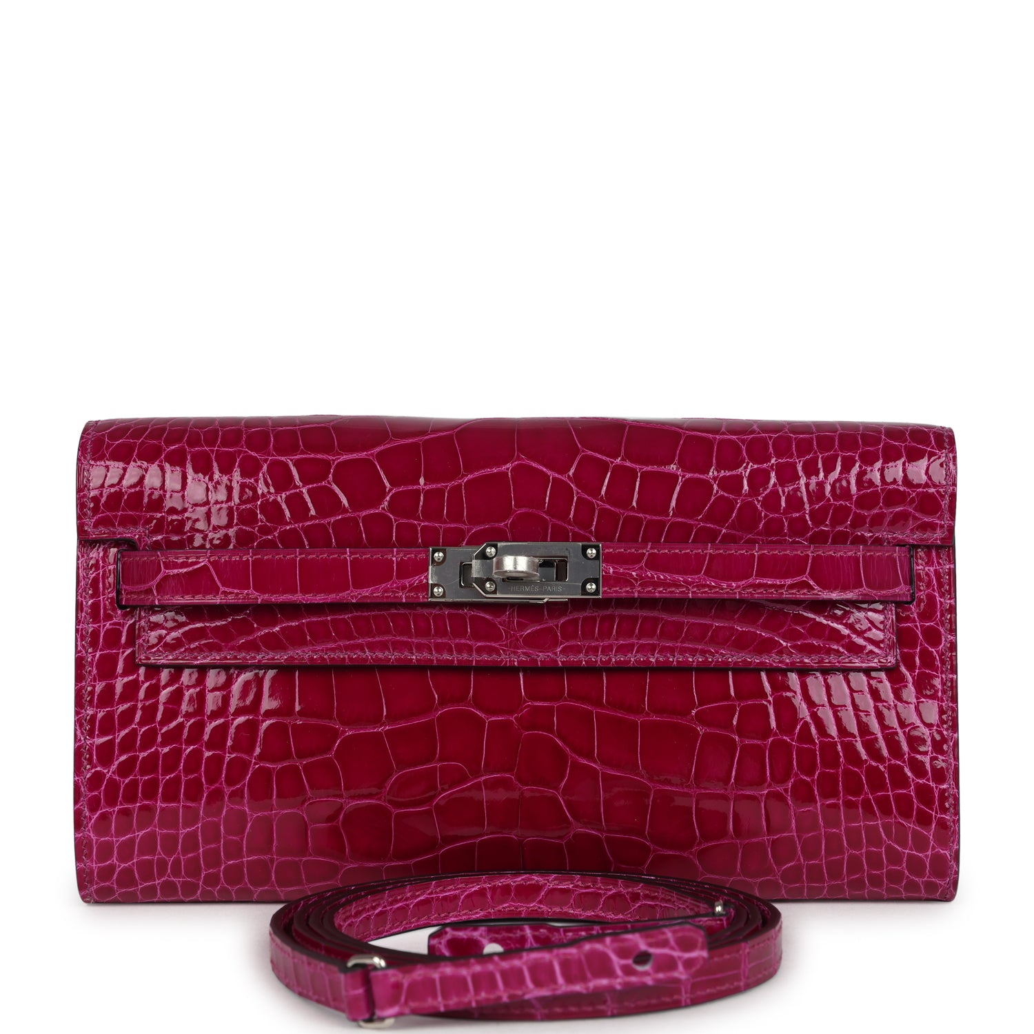 This Kelly Wallet To Go is in Rose Pourpre Shiny Alligator Mississippiensis leather with palladium hardware and has tonal stitching, two straps with front toggle closure and removable crossbody strap.
