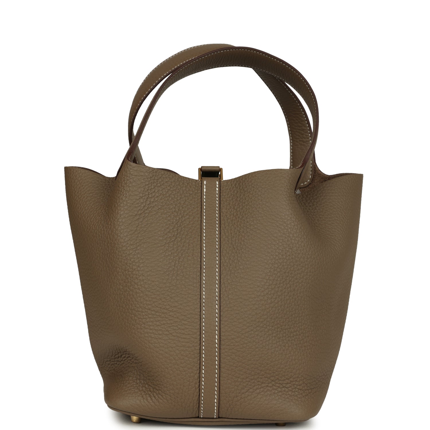 This Picotin is in Etoupe clemence leather with gold hardware and has white contrast stitching with two top handles.
