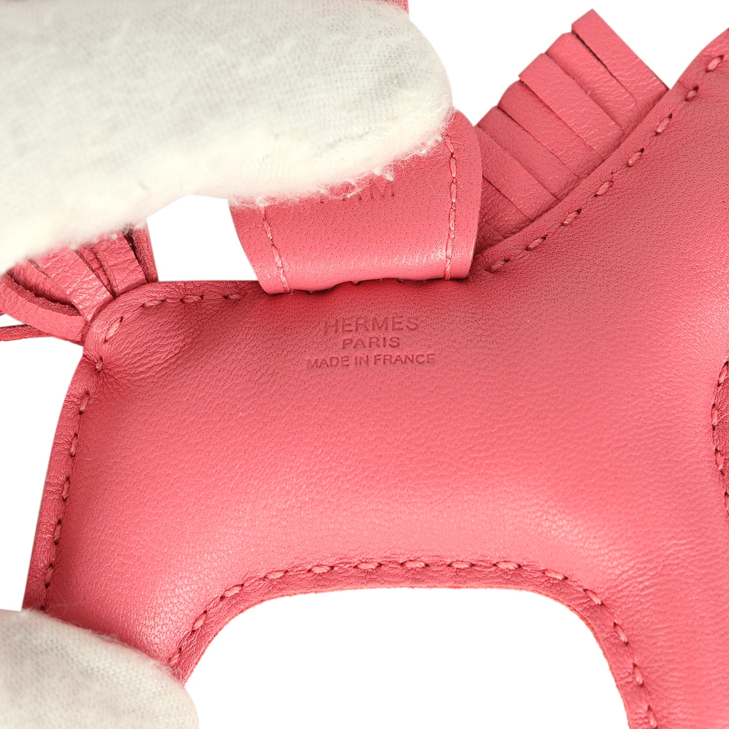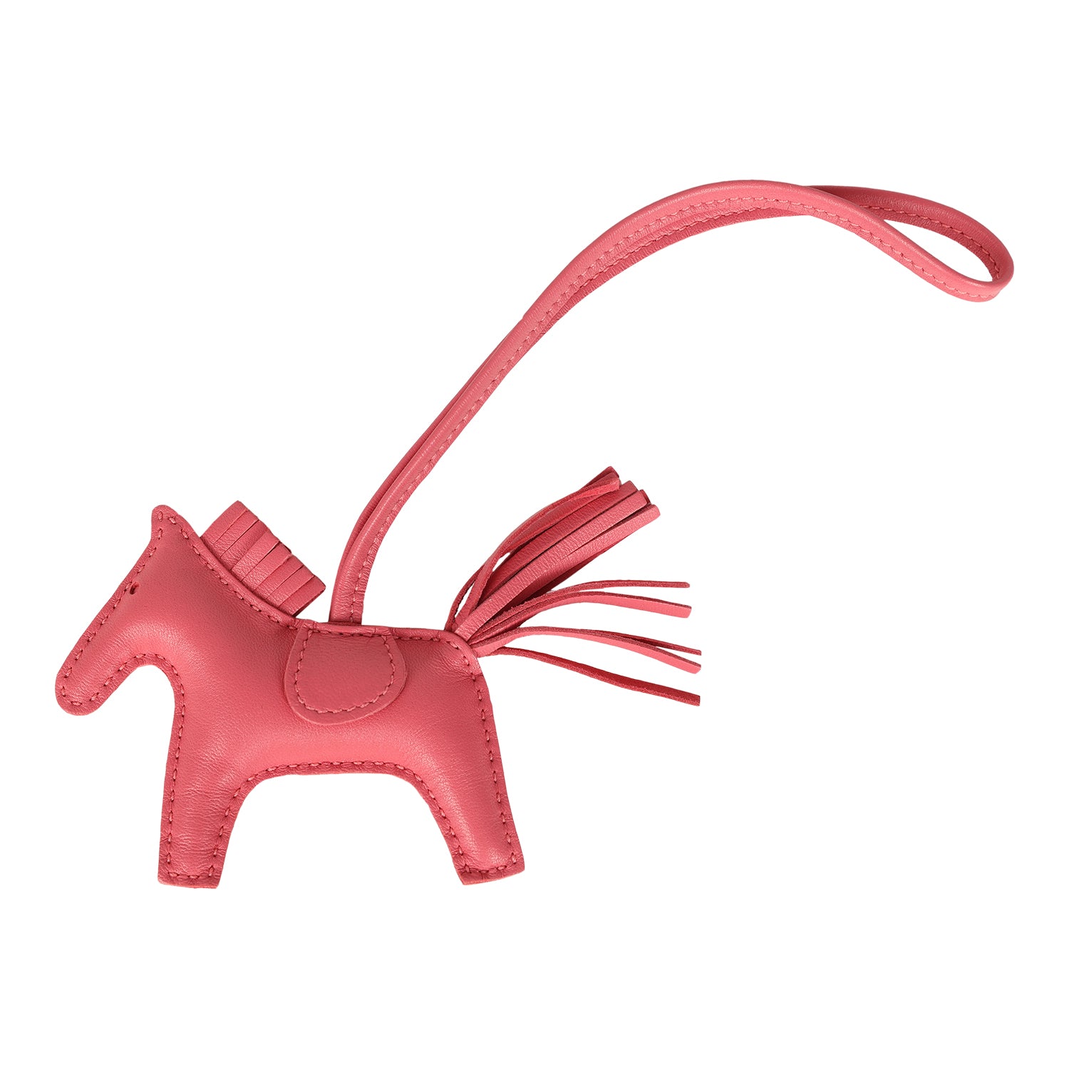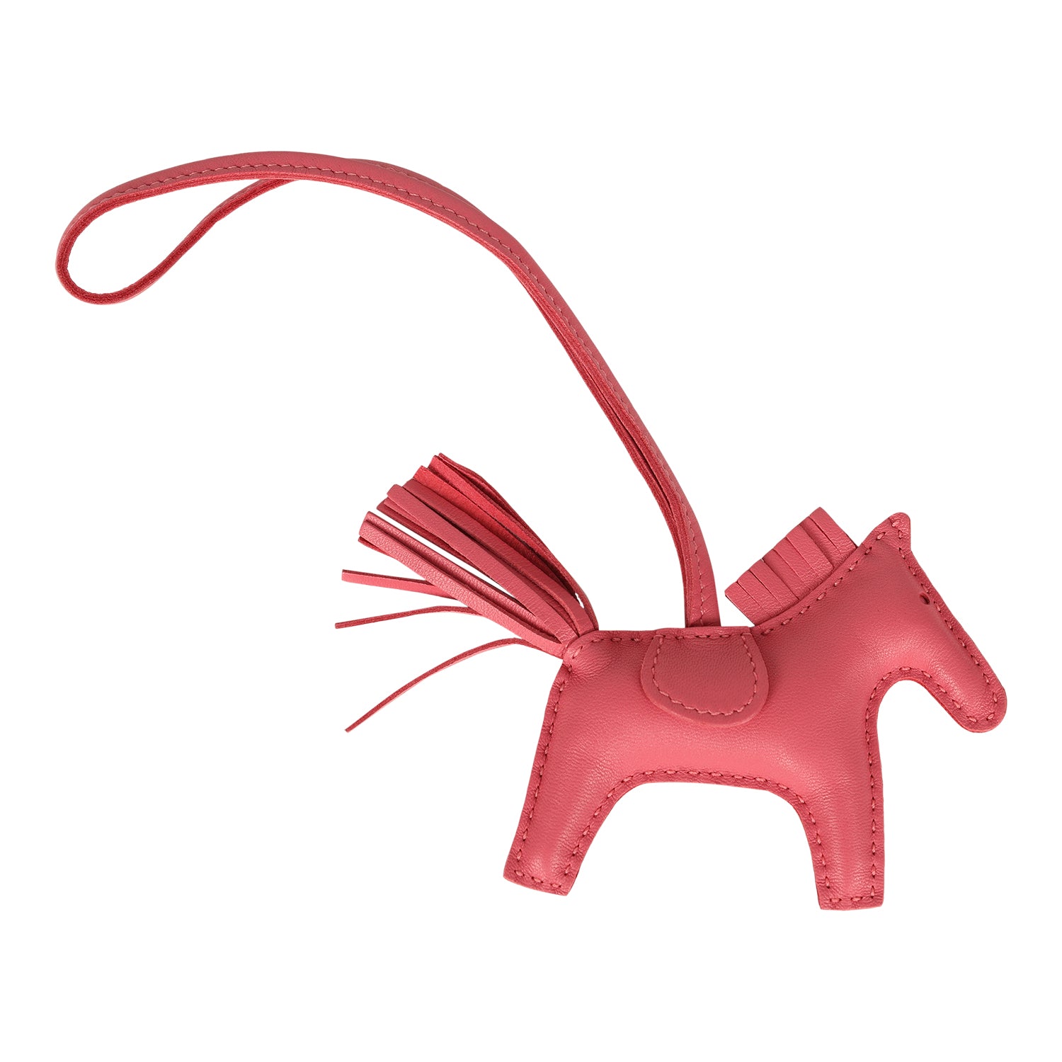This Hermes Rodeo Bag Charm PM is in Rose Azalee Milo lambskin leather, tonal stitching, and is accented with matching mane, tail, eyes, loop and saddle.