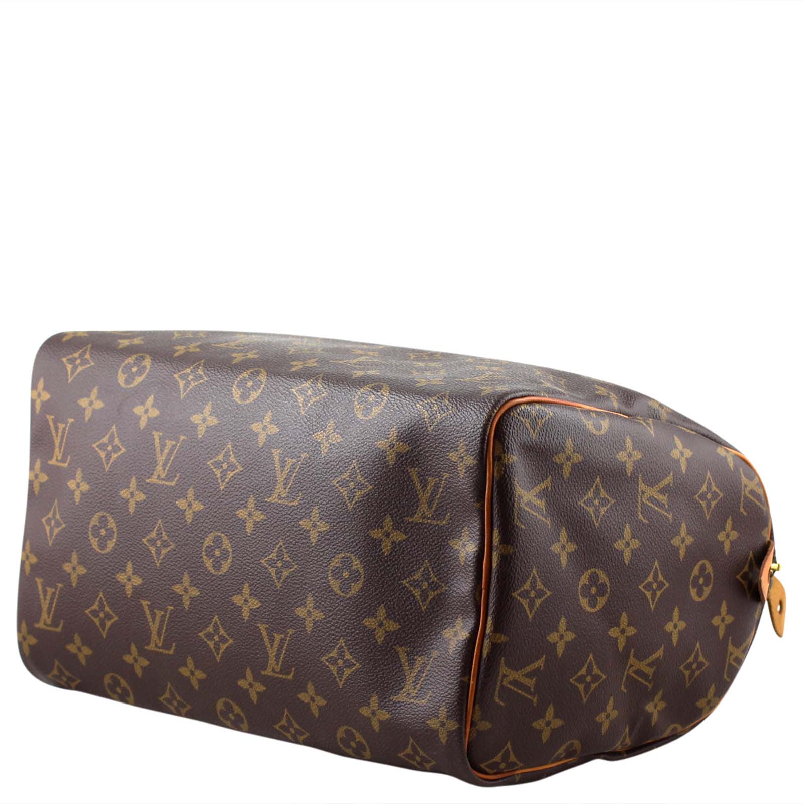 Features: Monogram canvas exterior, vachetta cowhide leather trim and double rolled handles, brass tone hardware; top zipper to main compartment; textile lined interior; internal hanging slip pocket and 1 x D-ring.