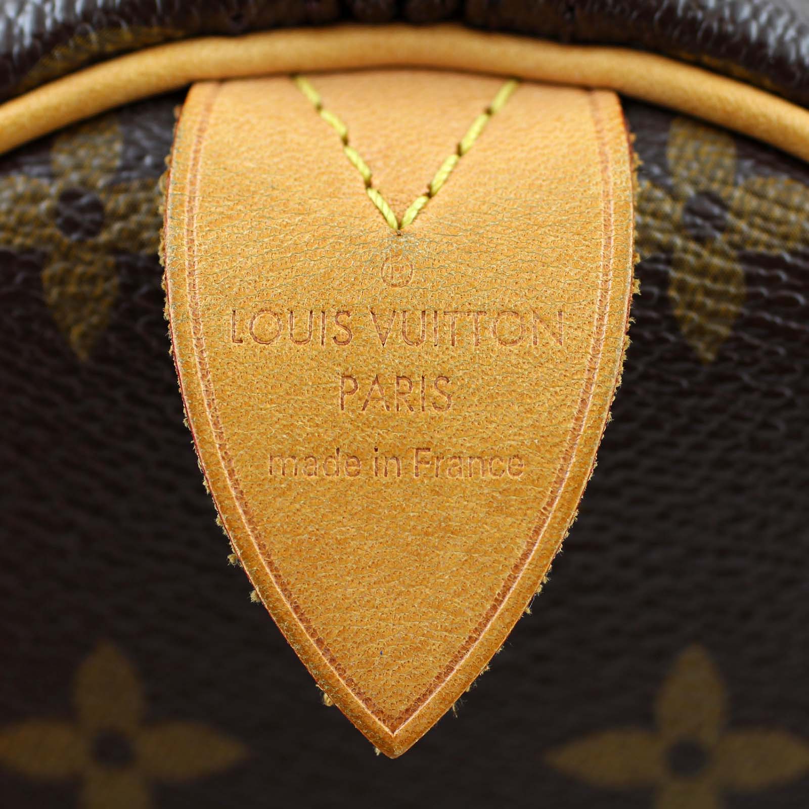 Features: Monogram canvas exterior, vachetta cowhide leather trim and double rolled handles, brass hardware including padlock and 2 x keys; top zipper to main compartment; textile lined interior; internal hanging slip pocket and 1 x D-ring.