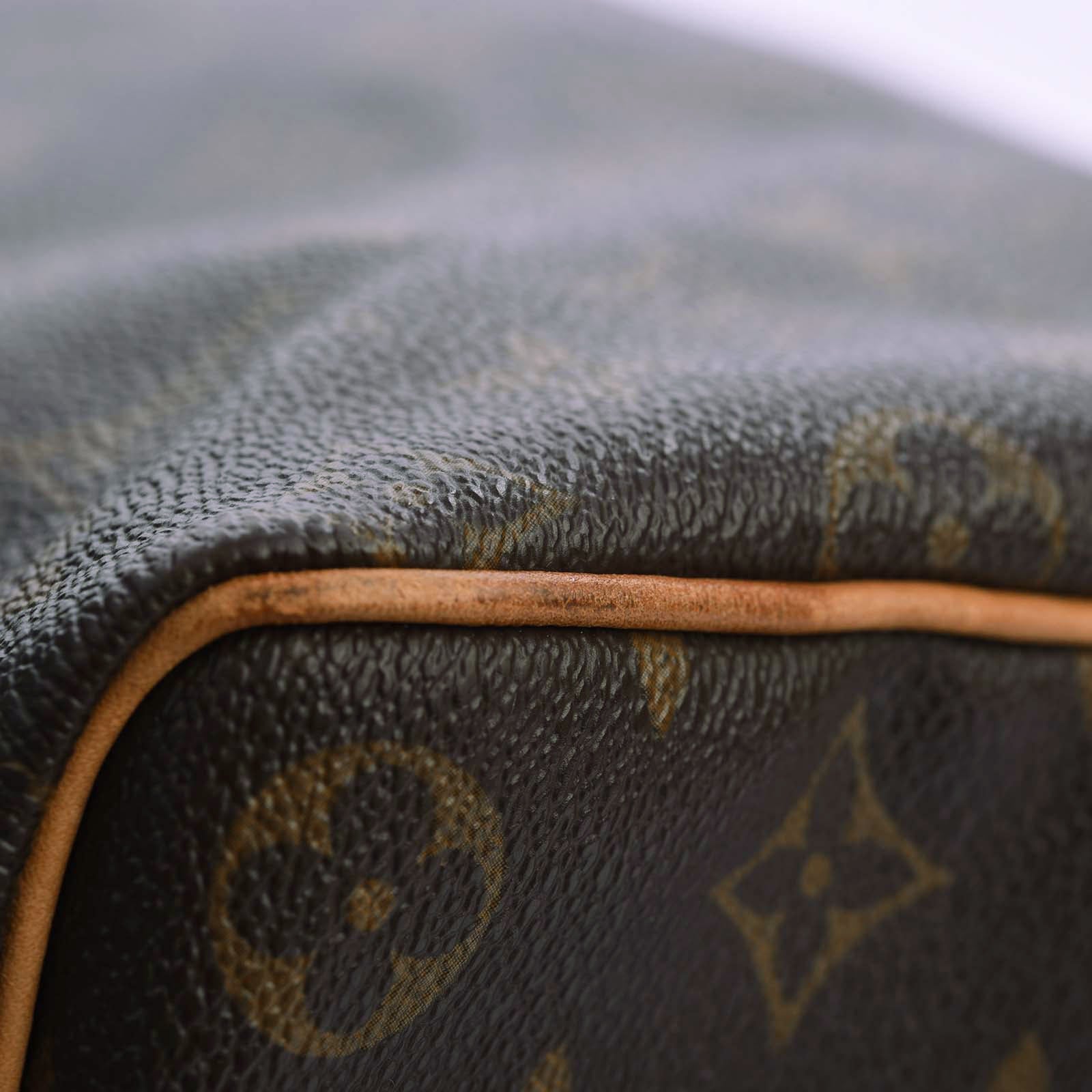 Features: Monogram canvas exterior; vachetta double rolled top handles; gold tone hardware; top zipper to main compartment; textile lined interior; internal hanging slip pocket.