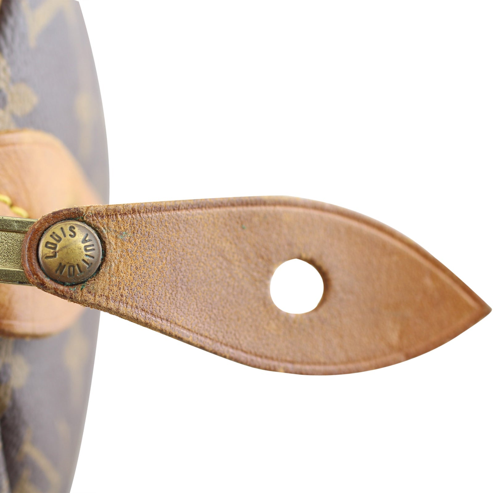 Features: Monogram canvas exterior; vachetta double rolled top handles; gold tone hardware; top zipper to main compartment; textile lined interior; internal hanging slip pocket.