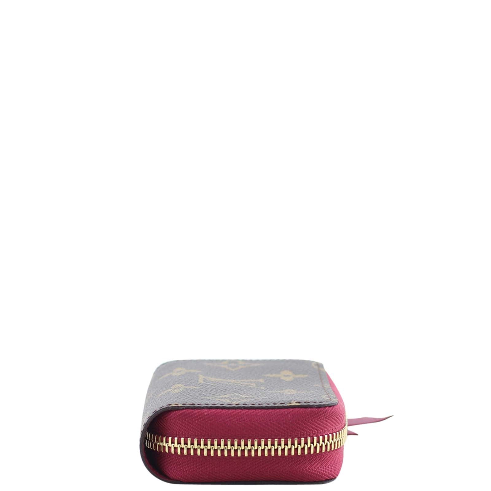 Features: Monogram canvas exterior; fuchsia three sided zip with leather zip pull; gold tone hardware; fuchsia leather lined interior with 5 accordion style compartments.