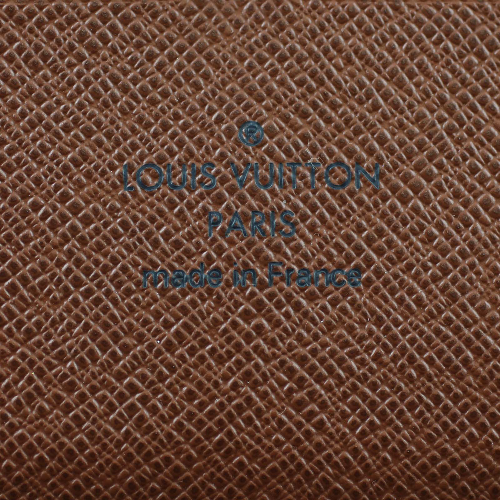 Features: Monogram canvas exterior; 3 sided zip entry; gold tone hardware; calfskin leather lined interior includes; large slot for passport or cheque book; 2 x gusseted compartments; 1 x bill slip pocket; 12 x card slots; 1 x pen holder and 1 x zipped coin compartment.