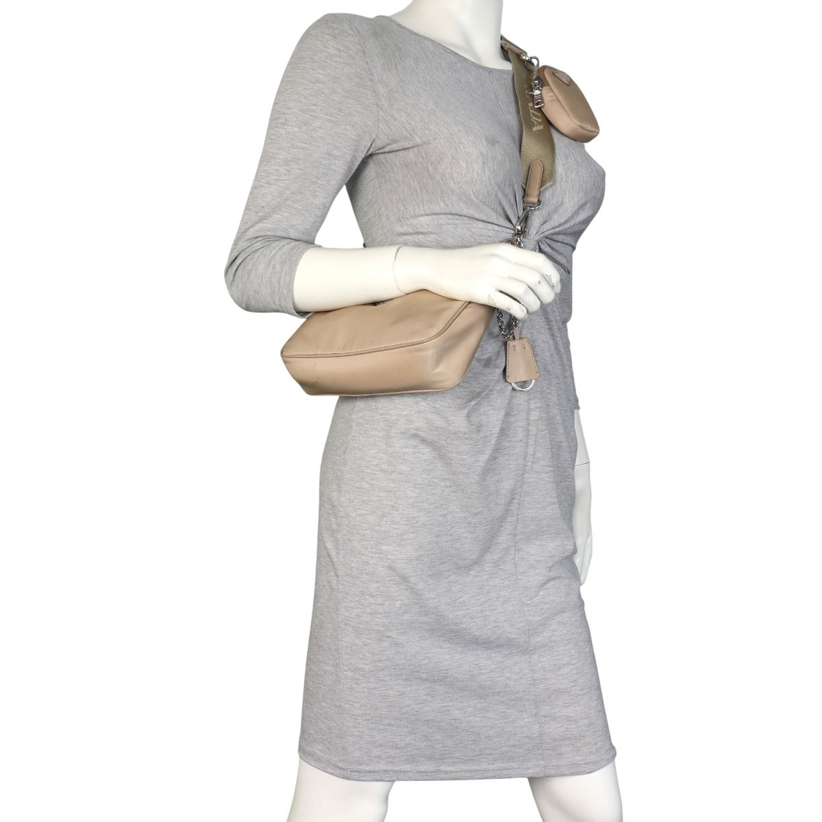 Comes with: Prada dust bag; mini dust bag; web strap with detachable pouch; chain strap; key ring in clochette.