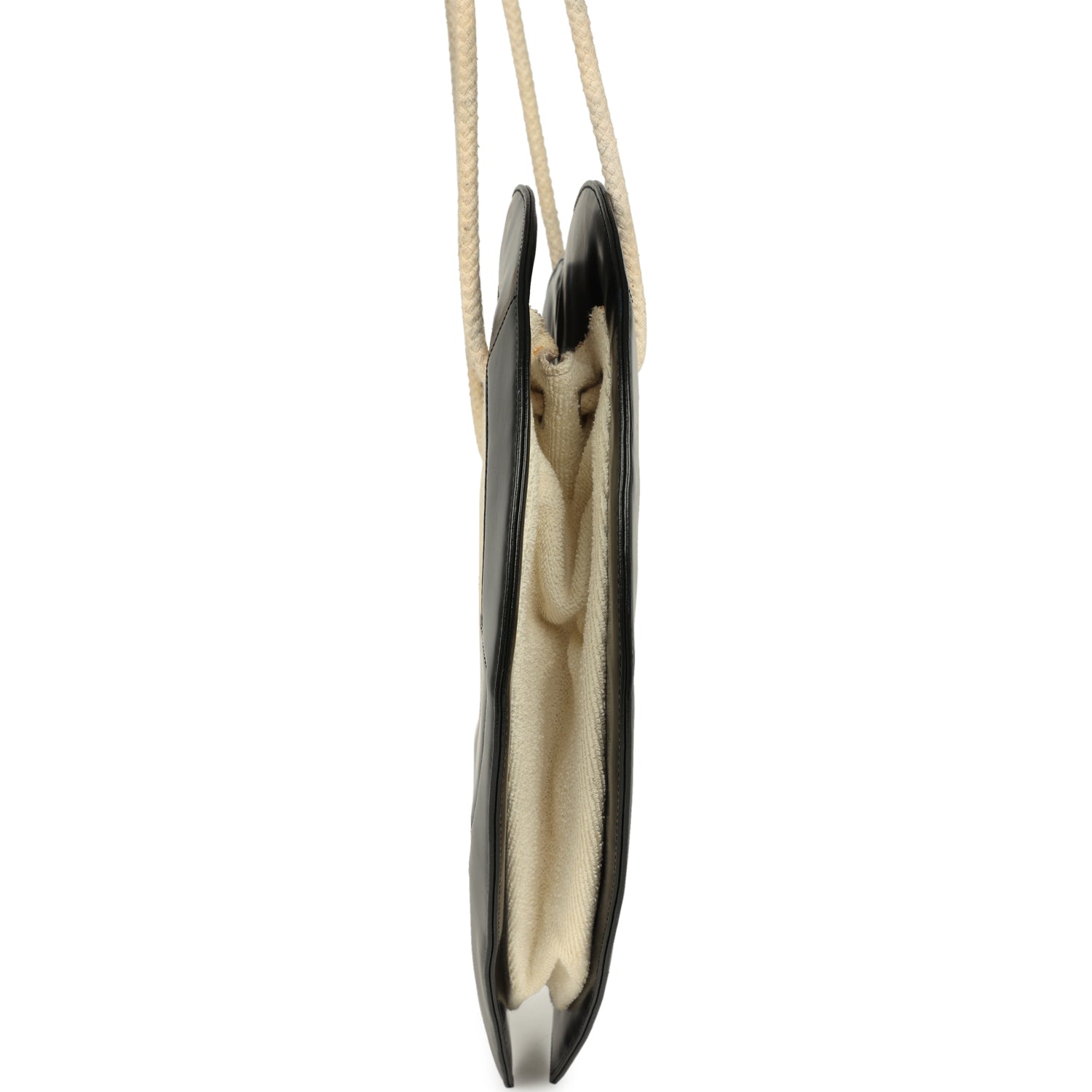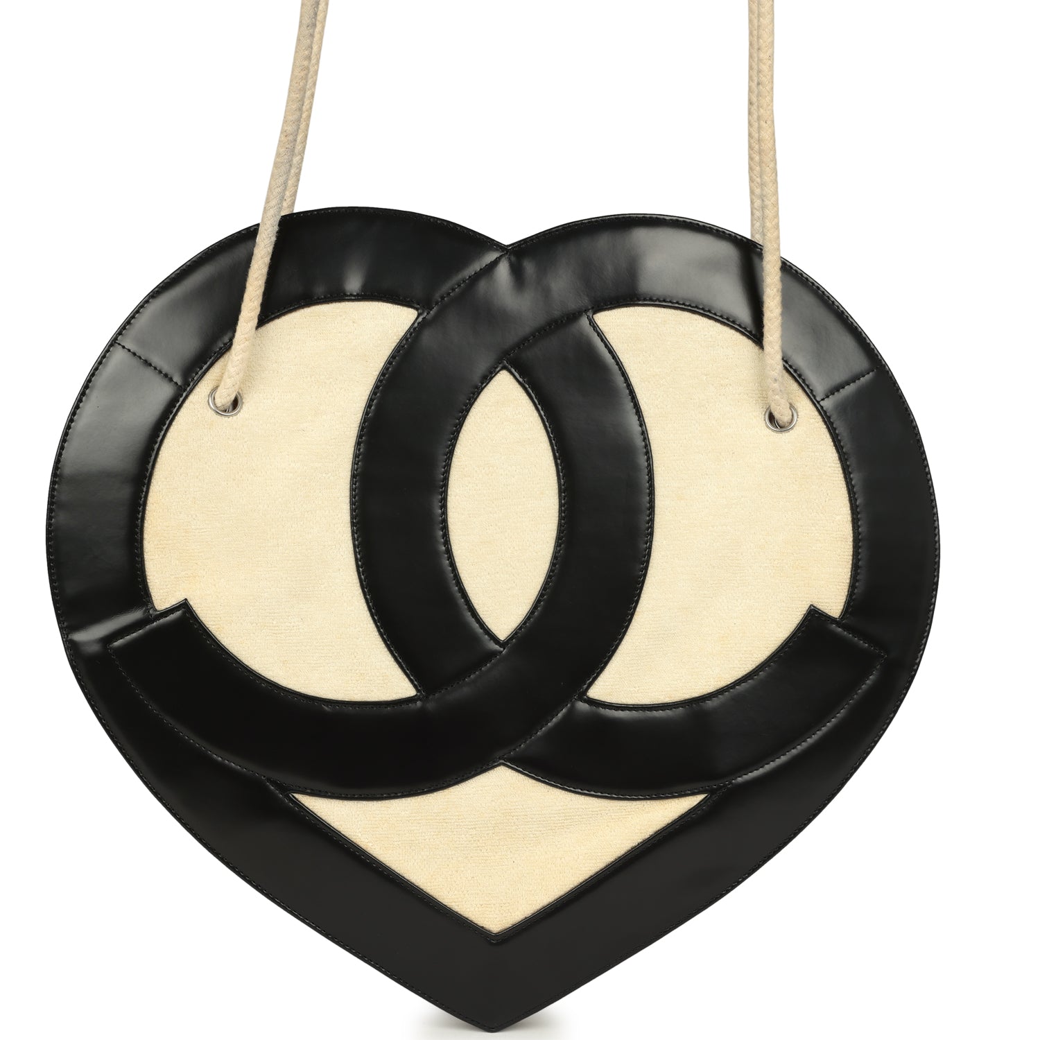 This Chanel Jumbo Heart Tote Bag is in cream terry cloth fabric and Black lambskin leather with silver tone hardware, featuring two braided cord shouder straps and open top design.