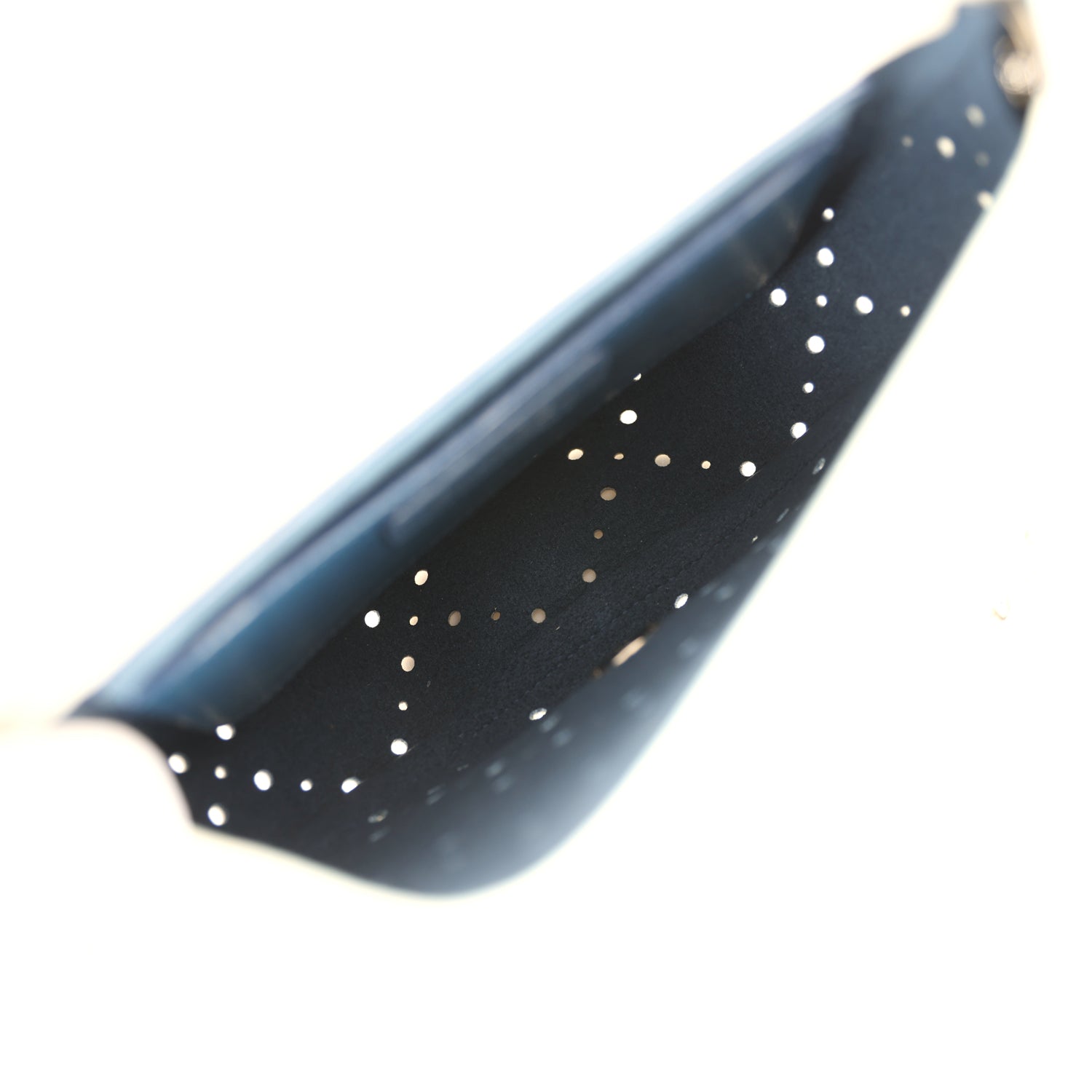 The interior is lined in blue suede lining and has a floating inside slip pocket.