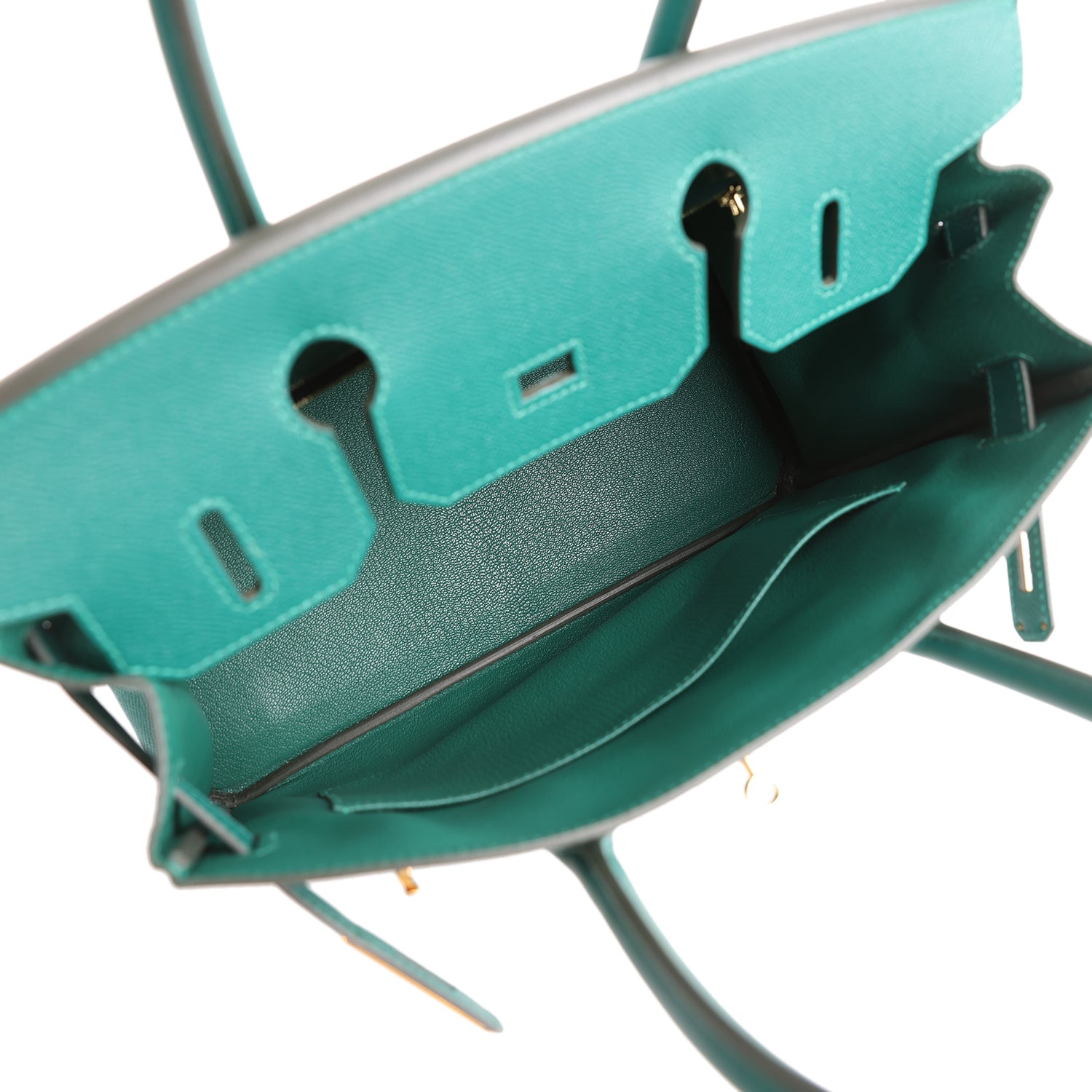 This Birkin is in Malachite Epsom leather with gold hardware and has tonal stitching, front flap, two straps with center toggle closure, clochette with lock and two keys, and double rolled handles.