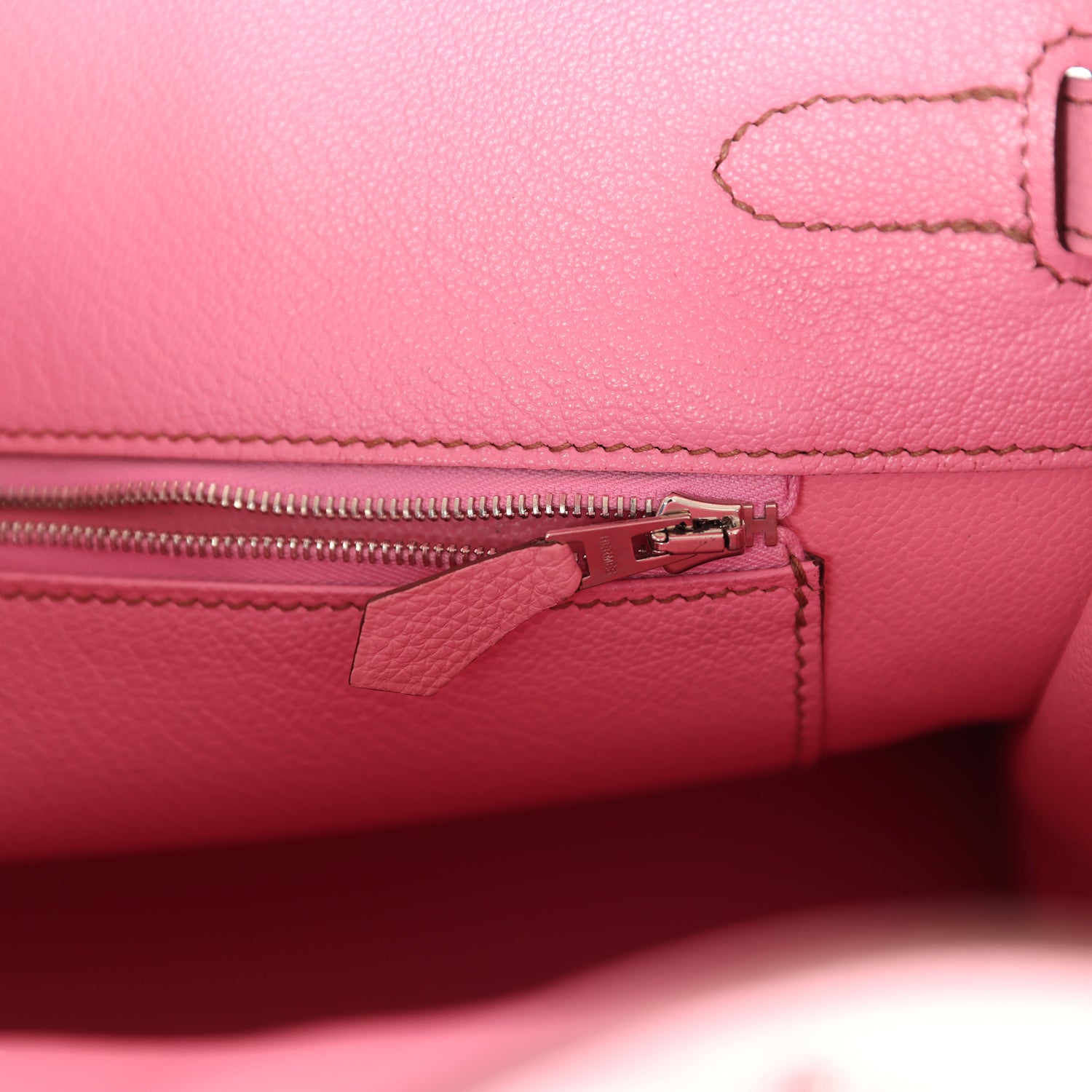 The interior is lined with Bubblegum chevre and has one zip pocket with an Hermes engraved zipper pull and an open pocket on the opposite side.