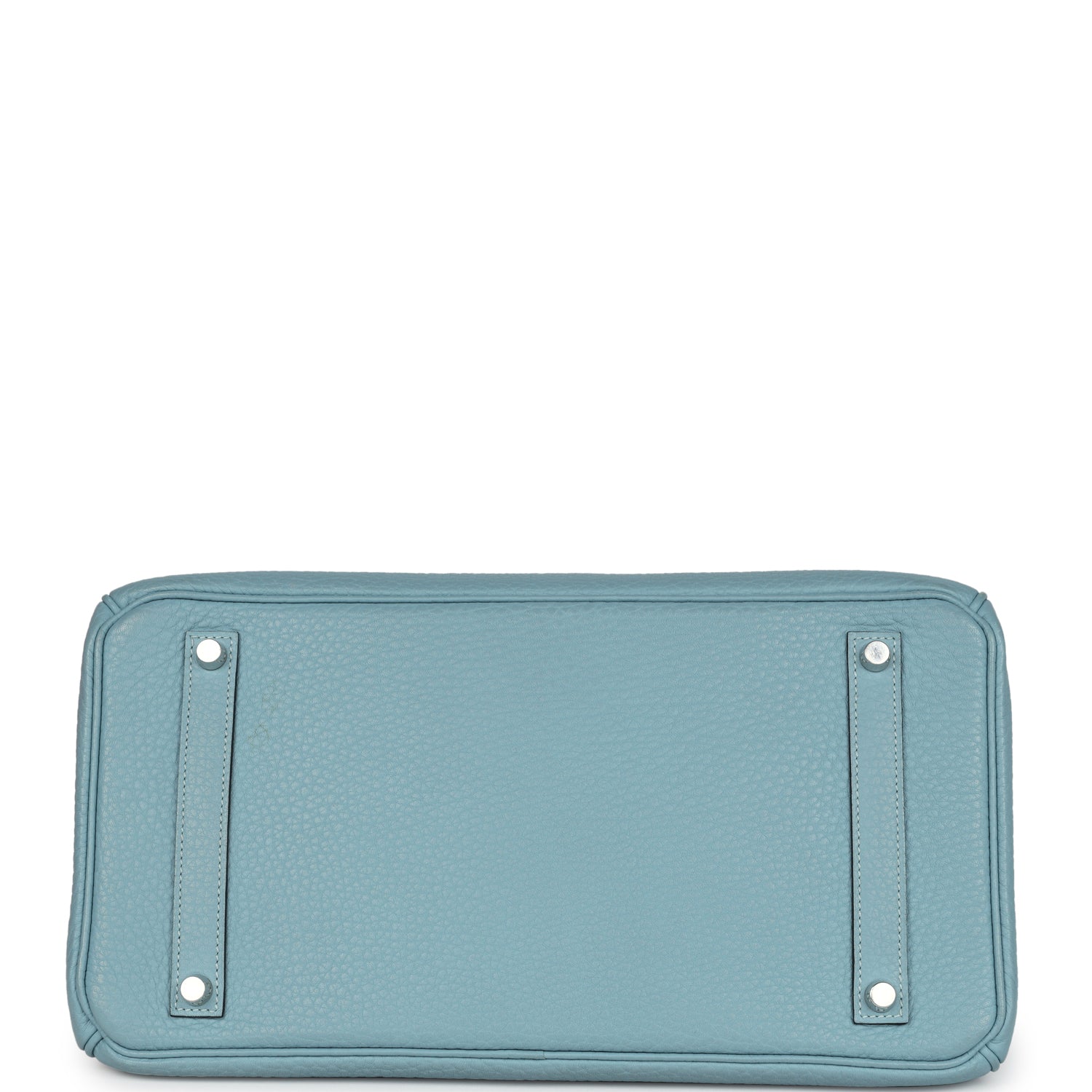 This Birkin is in Ciel togo leather with palladium hardware and has tonal stitching, front flap, two straps with center toggle closure, clochette with lock and two keys, and double rolled handles.