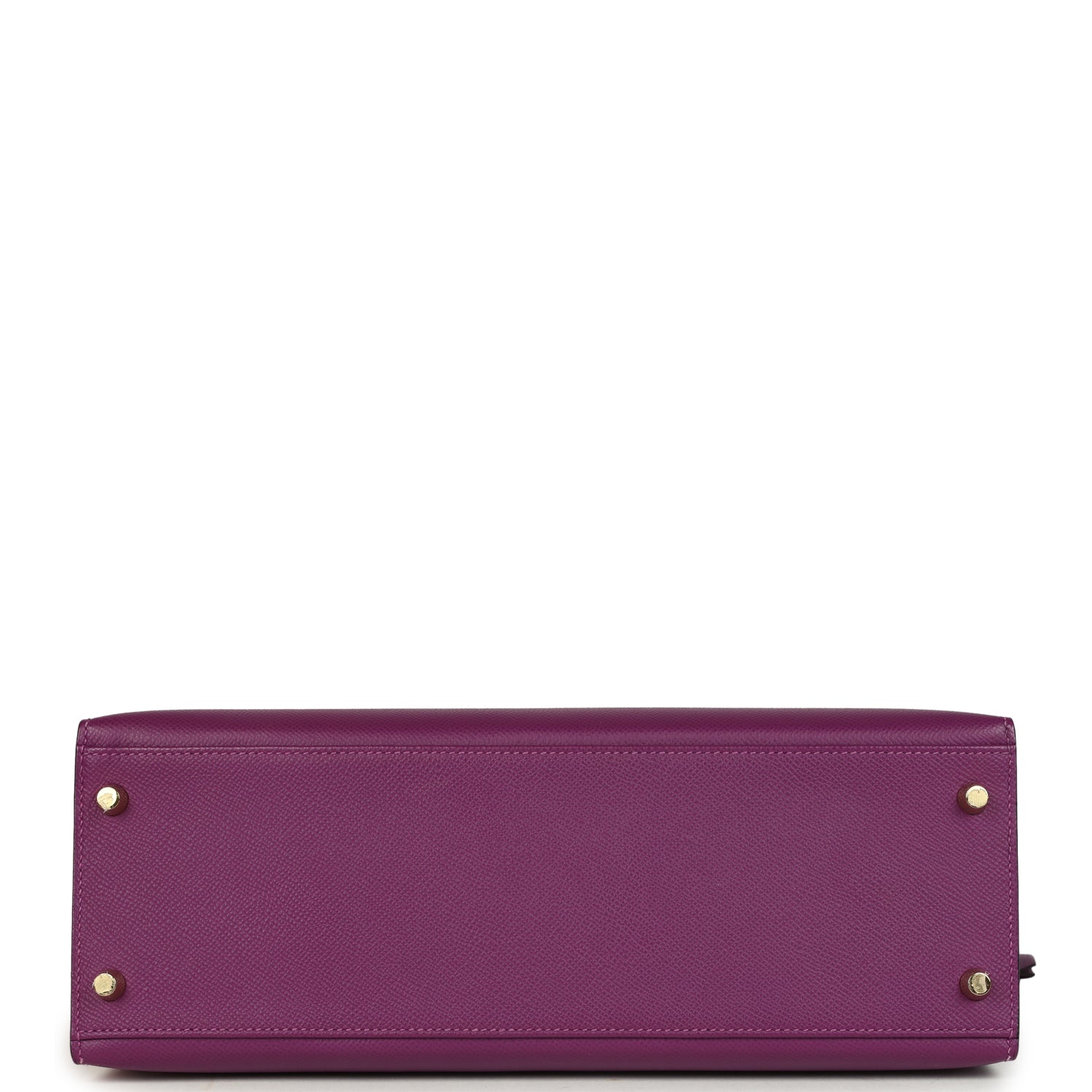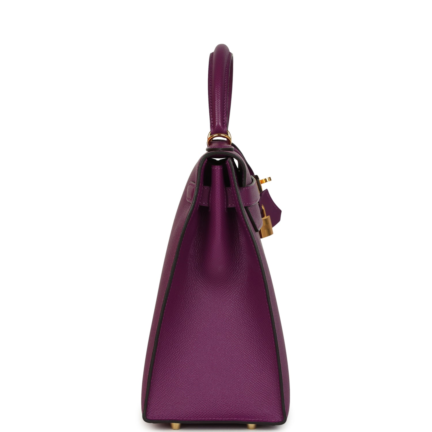 This Kelly, in the Sellier style, is in Anemone epsom leather with gold hardware and has tonal stitching, a front toggle closure, a clochette with lock, two keys, a single rolled handle and removable shoulder strap.