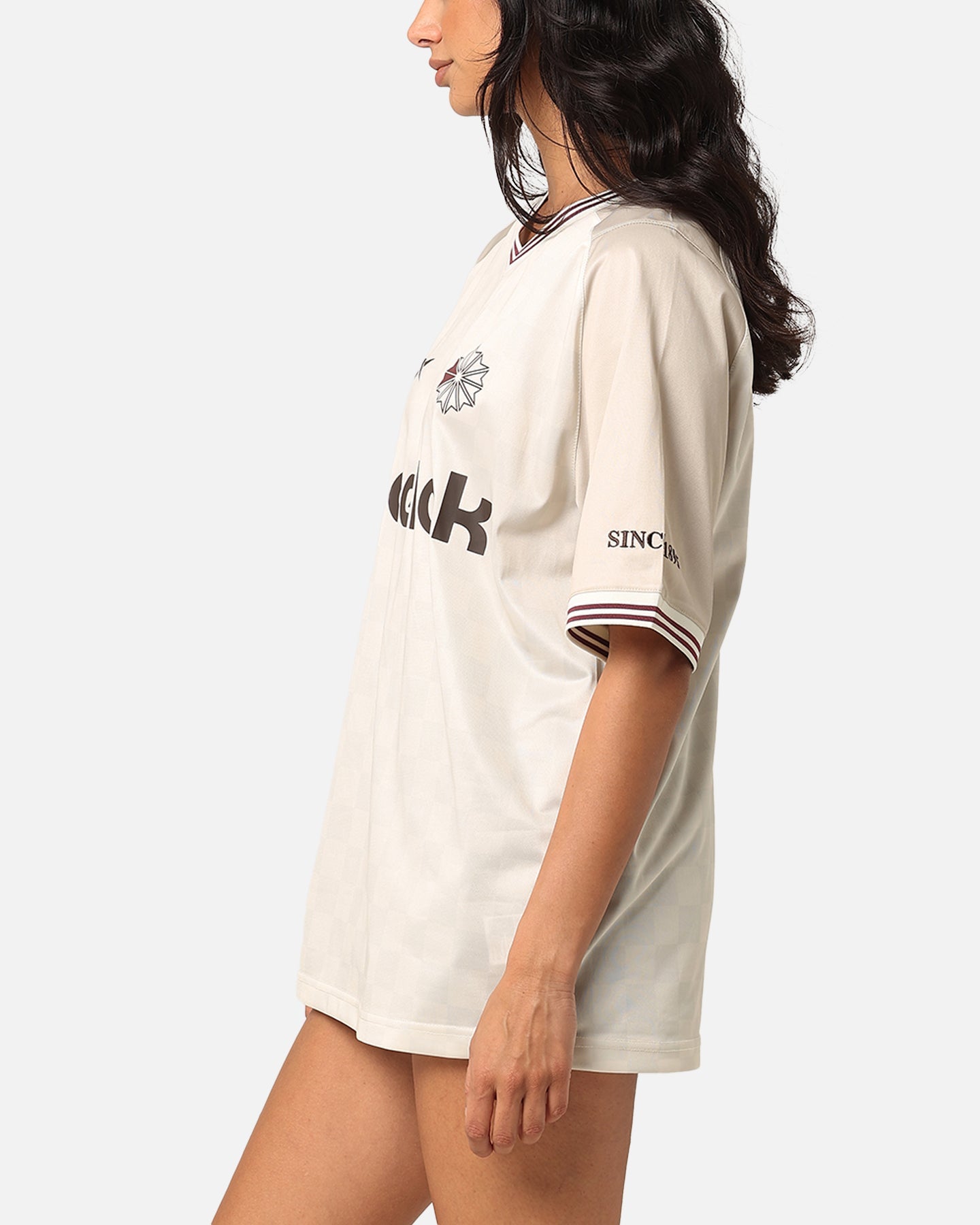 The Beige Heritage Jersey by Reebok is the perfect blend of street and sportswear. This tee features embroidered graphics on the sleeves and printed graphics on the front and back for an iconic vibe. Finished with contrast ribbed trims and twin needle stitching for extra reinforcement. Cop yours today at Culture Kings. - Printed graphics - Embroidered - Contrast ribbed trims - V neck neckline - All over chequered print - Dropped shoulders - Twin needle stitching - Regular fit - Colour: Utility Brown - Style: DWMJ243