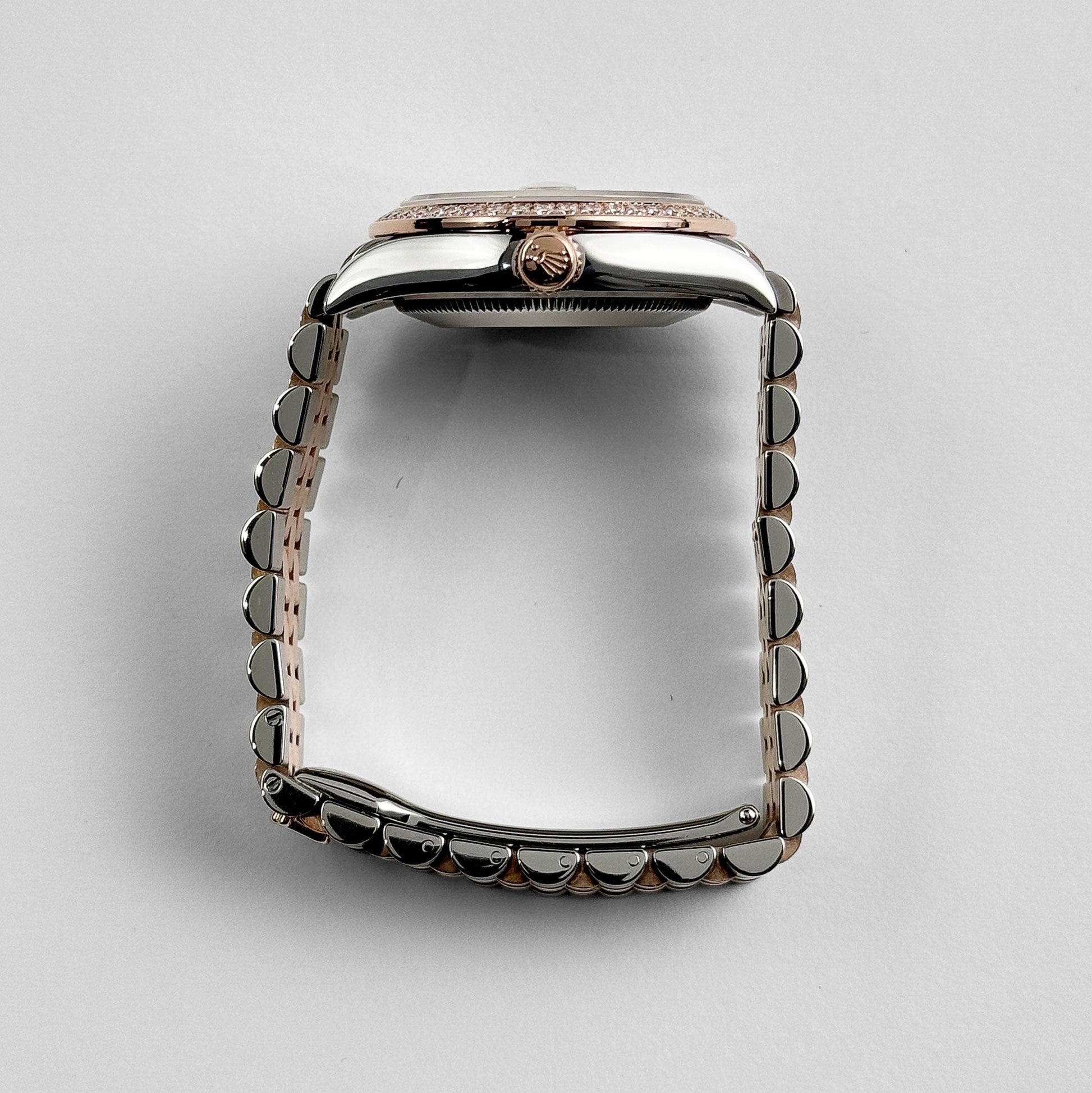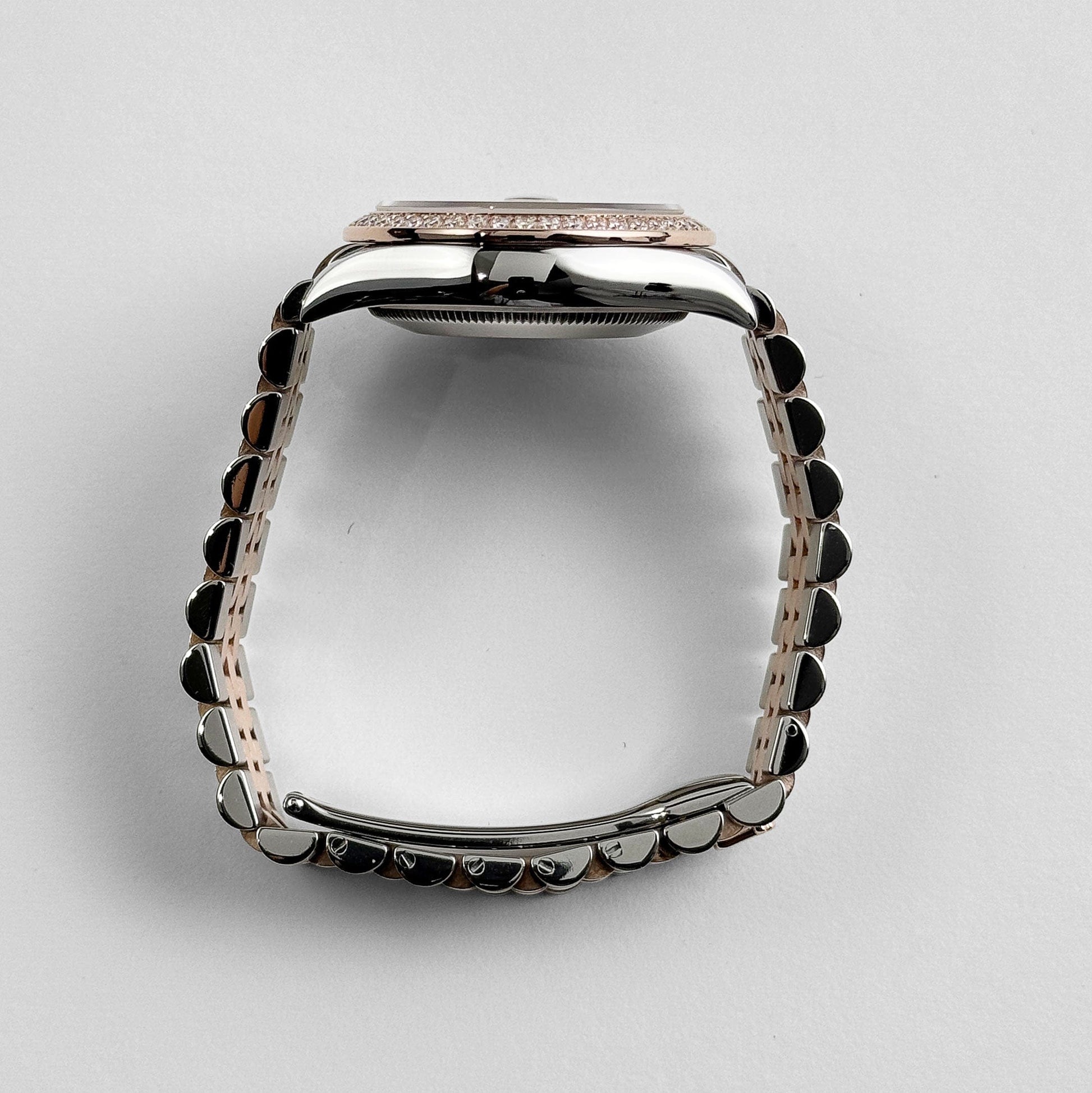 The Rolex Datejust 31 278381RBR in stainless steel and rose gold blends feminine refinement with measured luxury. Its 31 mm case hosts a factory-set diamond bezel that frames a warm brown dial. The dial is punctuated by rose gold Roman numerals, while the VI numeral is highlighted with diamonds for added nuance. The date aperture at 3 o’clock is magnified by Rolex’s cyclops lens for clarity. Fitted to a Jubilee bracelet, this model balances elegant wearability with versatility.