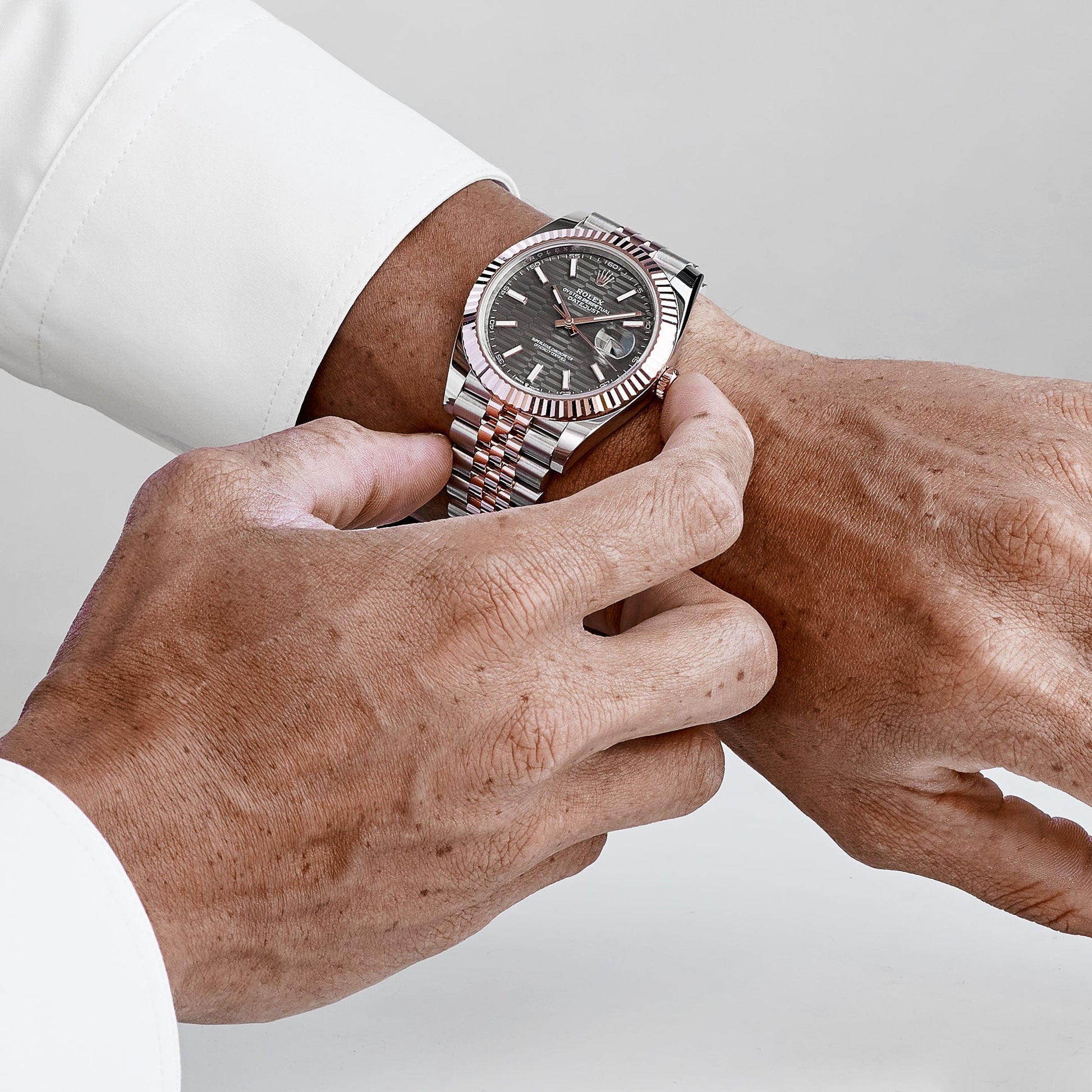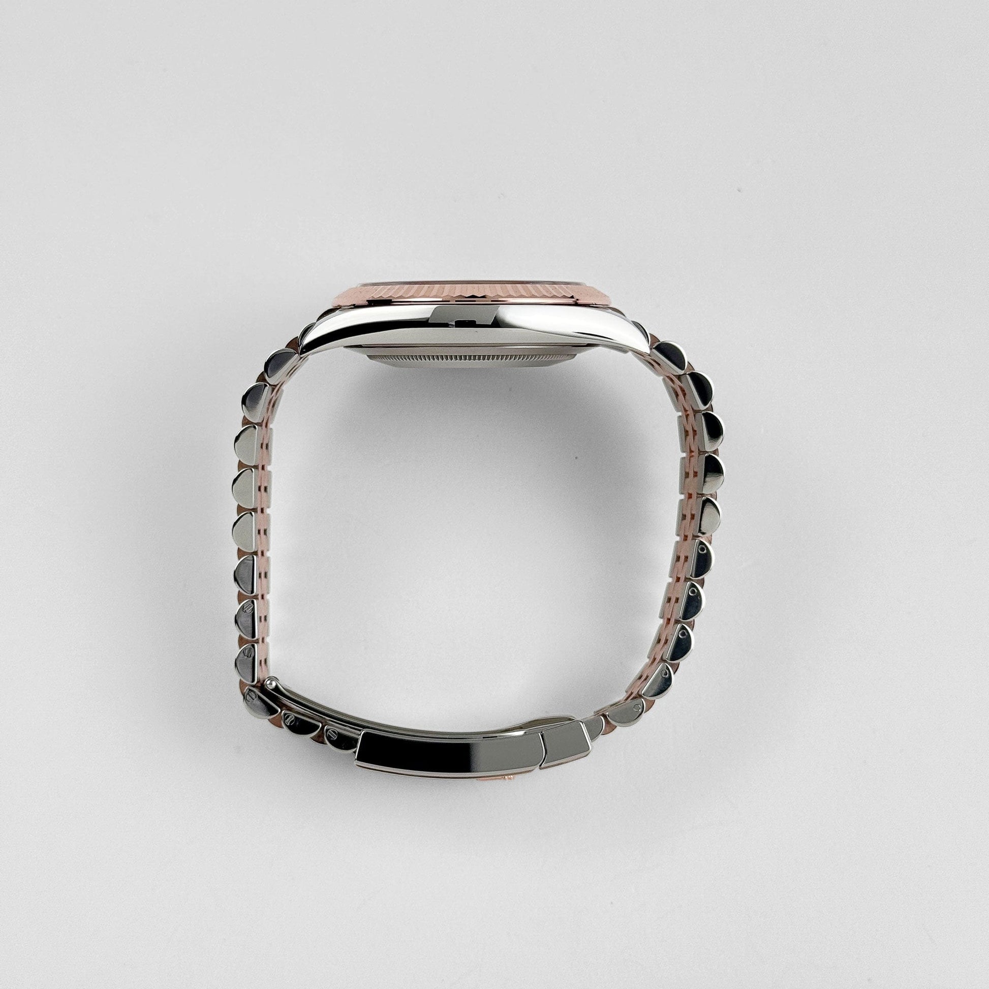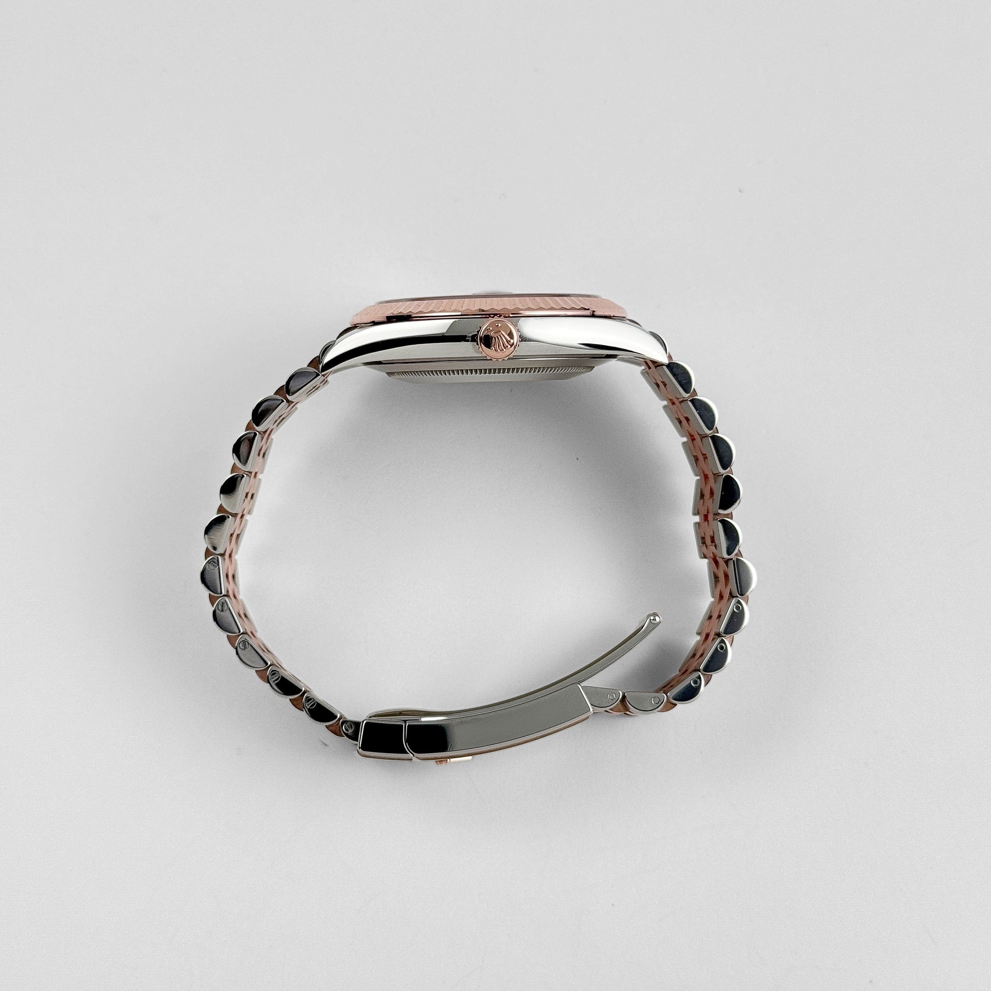 The Rolex Datejust 41 126331 merges rose gold and stainless steel in a refined two-tone execution. Its 41mm case is framed by a fluted rose gold bezel and secured with a Jubilee bracelet, striking a balance between dressy elegance and everyday wearability.