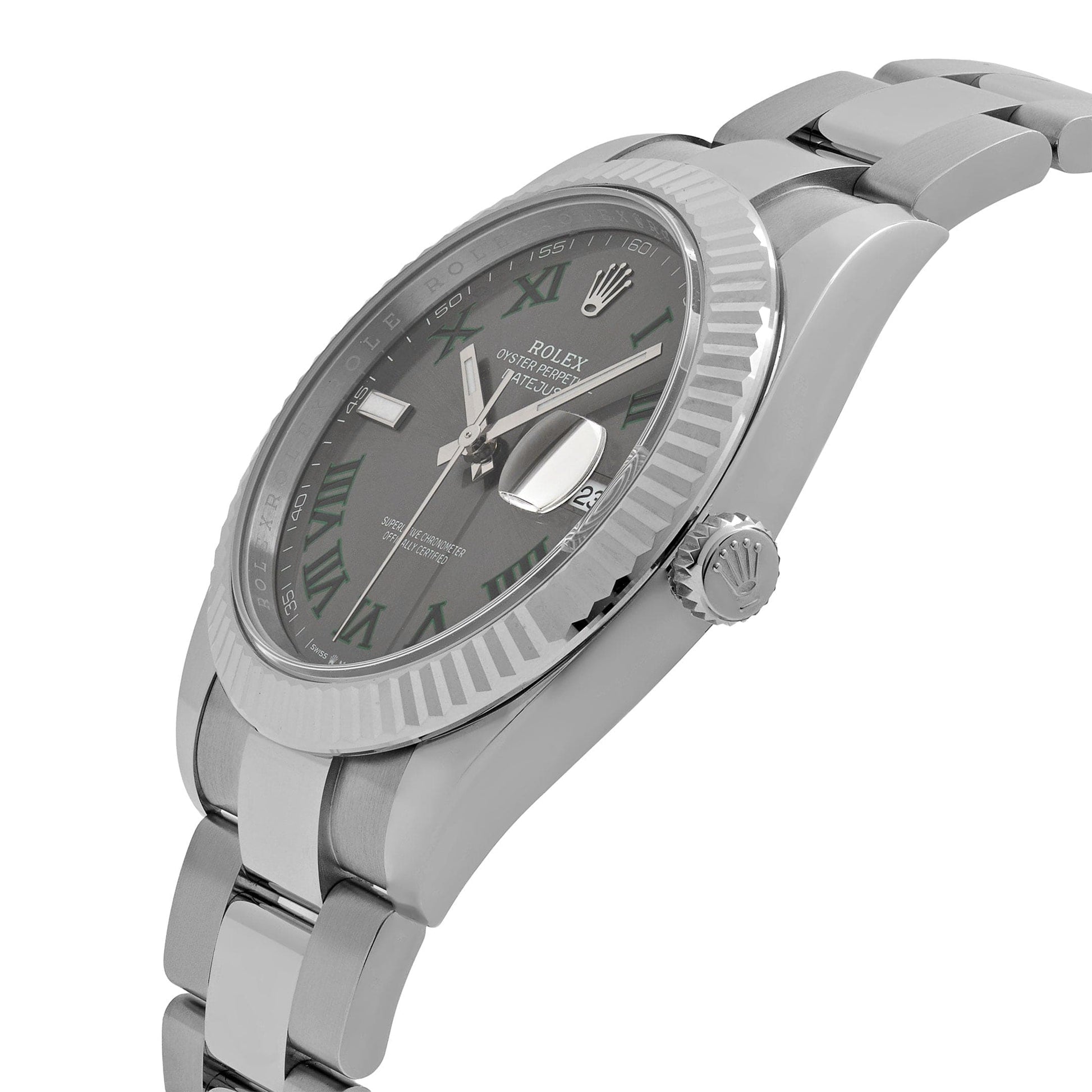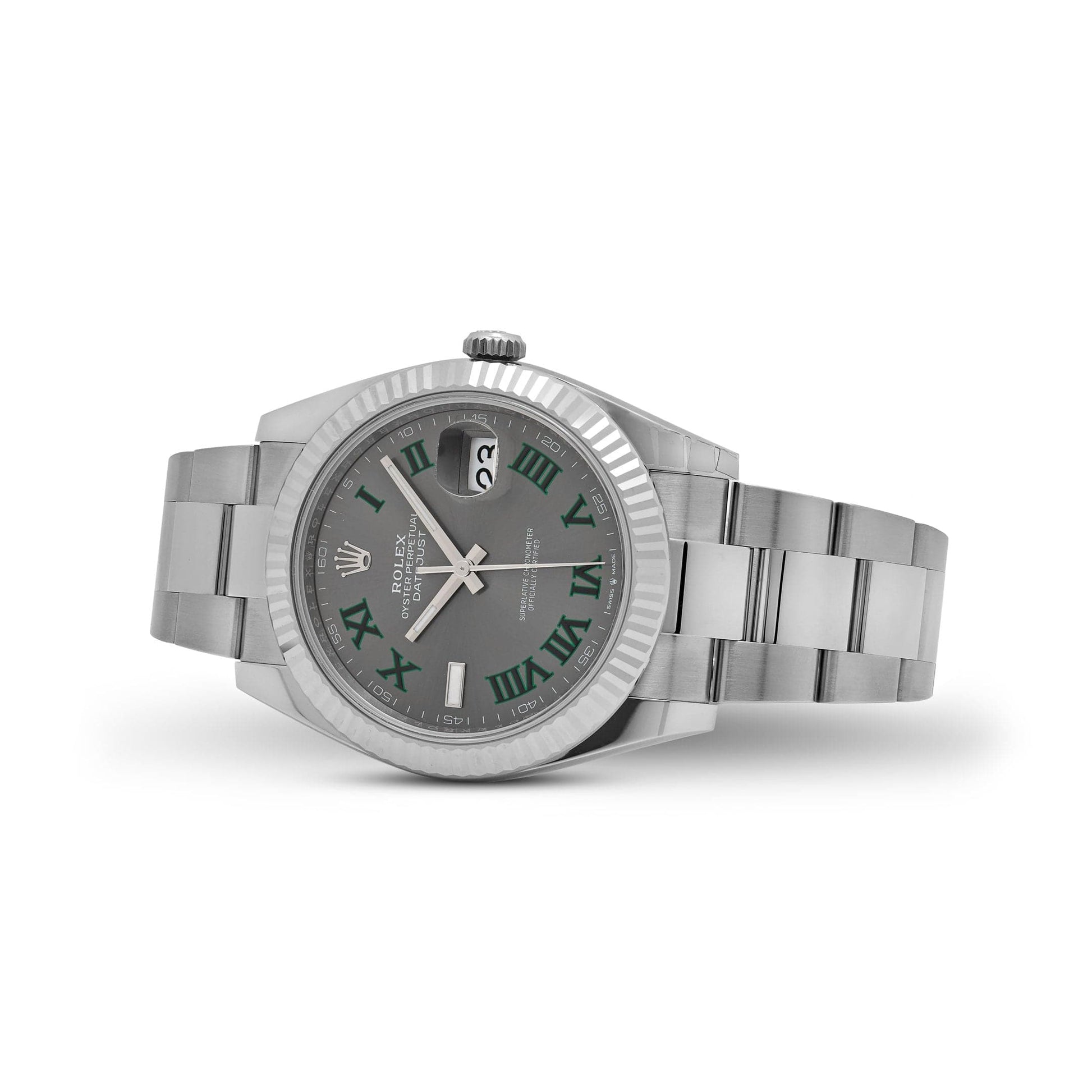 The Rolex Datejust is designed with a 41mm stainless steel case, complemented by the signature stainless steel fluted bezel, and styled on an oyster bracelet. The slate dial hosts a date feature at 3 o'clock. Roman numeral hour markers in green are representative of the famous Wimbledon court, a place where luxury and sports are perfectly paired. The Rolex Datejust 126334 is a classic model and the next addition to your collection.