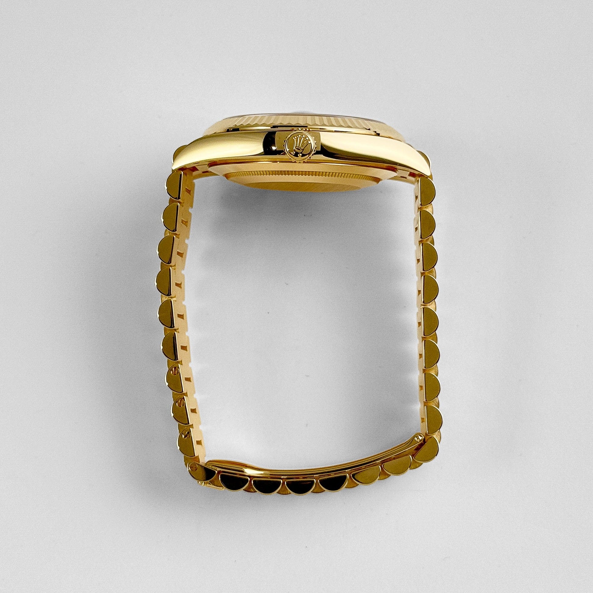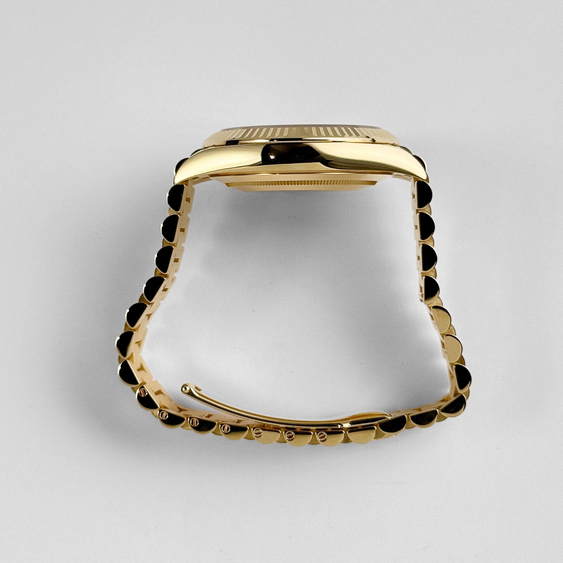 The Rolex Day-Date 40 ref. 228238 offers a refined expression of Rolex prestige. Crafted in solid 18 kt yellow gold, its 40 mm case is complemented by a signature the President bracelet. The crisp white dial displays polished yellow-gold Roman numerals and matching hands, framed by the fluted bezel that epitomizes Rolex’s classic design language. Its combination of understated aesthetic, precious-metal presence, and Rolex’s hallmark craftsmanship make it a staple for those seeking timeless elegance with intrinsic value.