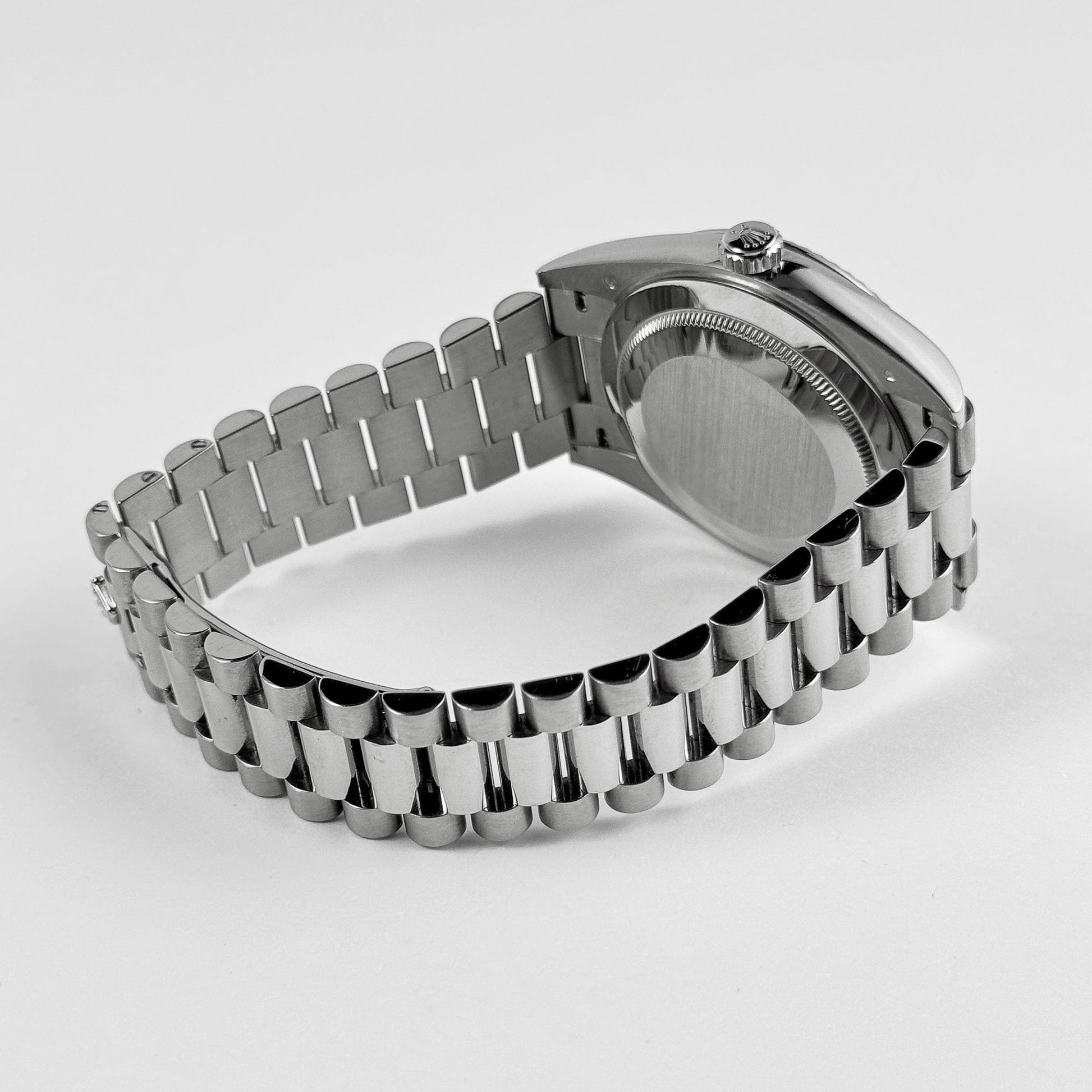 As part of the legendary Day-Date collection, it includes the signature day display at 12 o’clock and a date window at 3 o’clock, both magnified by Rolex’s Cyclops lens for optimal legibility. Paired with the President bracelet, renowned for its polished three-link design and unparalleled comfort, the Day-Date 228239 is a symbol of Rolex’s commitment to precision and luxury. This exceptional timepiece is a coveted choice for collectors who value timeless style and exceptional craftsmanship.