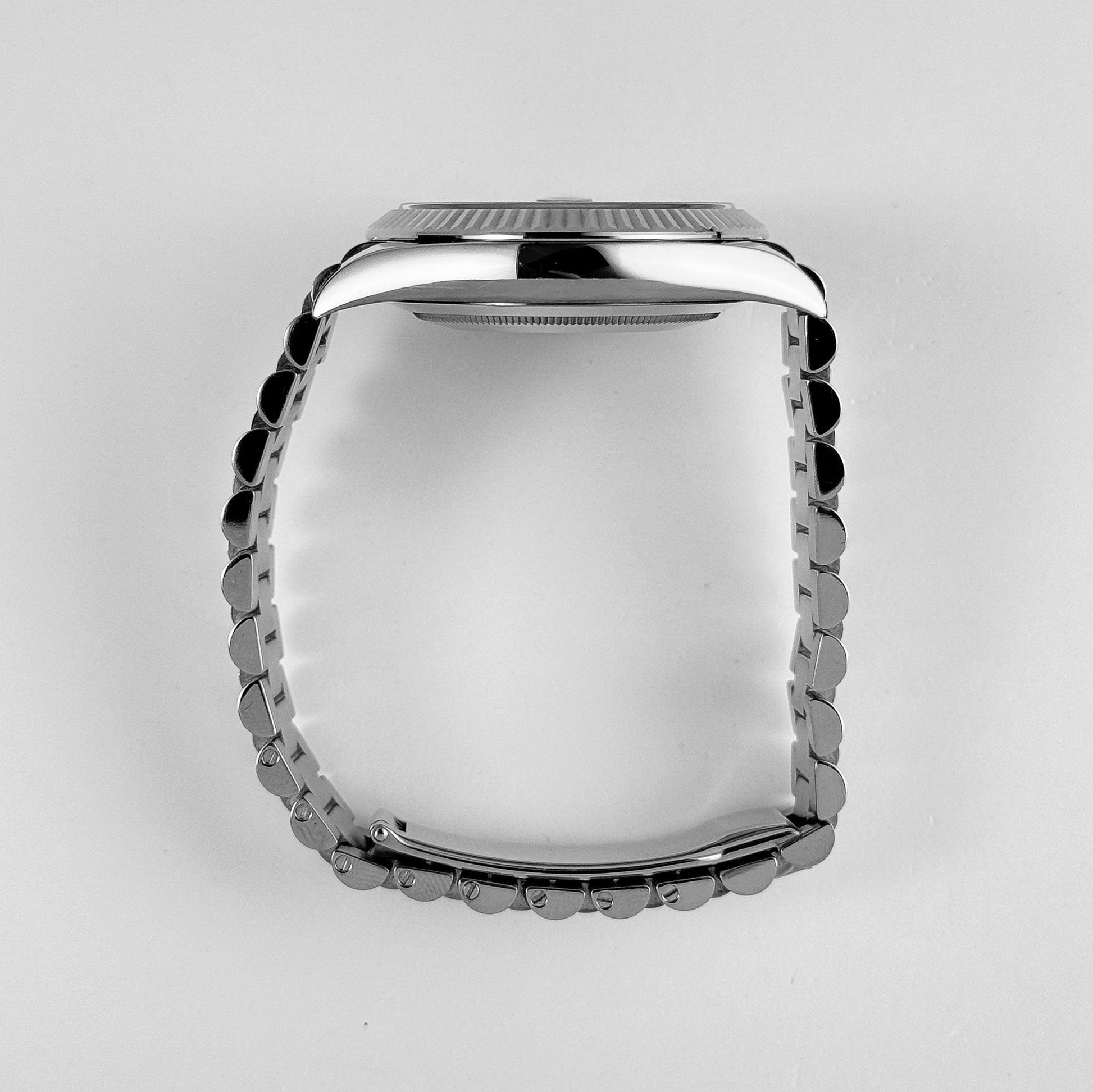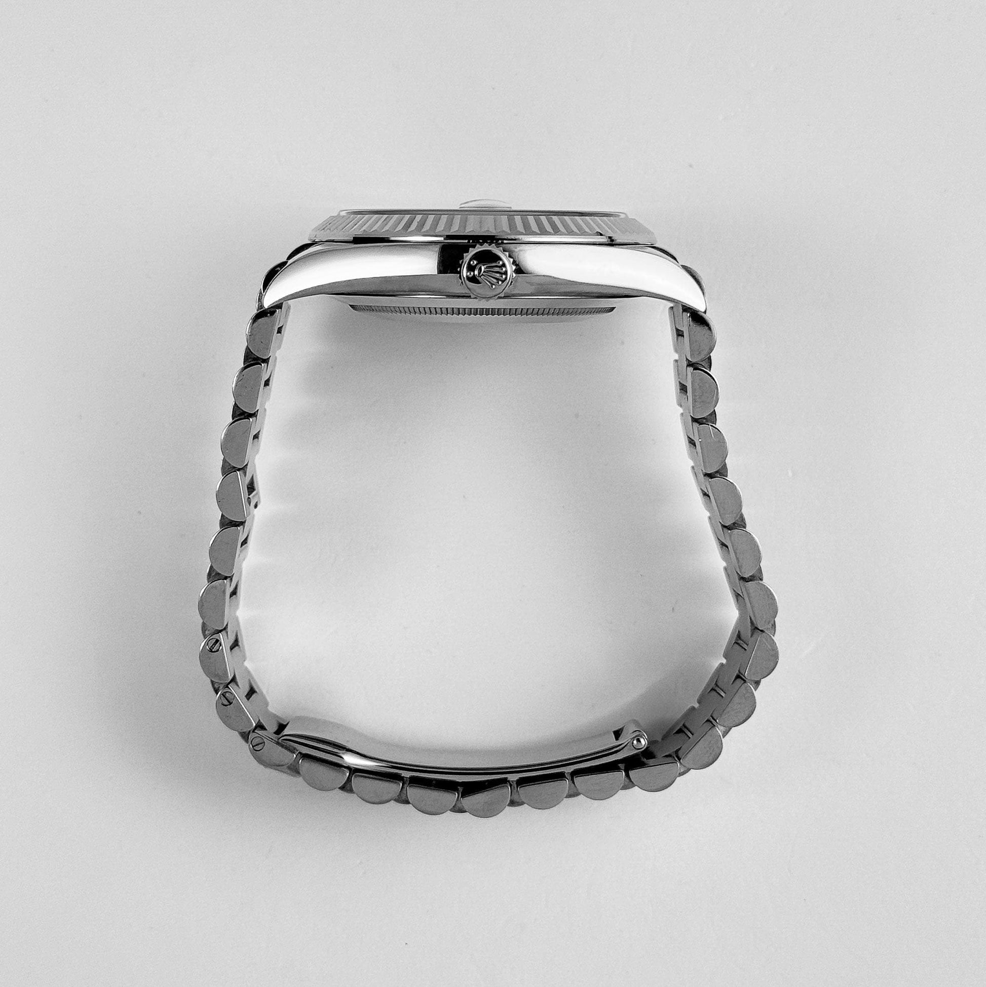 The Rolex Day-Date 228239 is a timeless masterpiece of elegance and sophistication, crafted in 18k white gold for a refined and luxurious aesthetic. Its 40mm case is complemented by the iconic fluted bezel, a hallmark of Rolex’s craftsmanship and attention to detail. The rich blue sunburst dial serves as the highlight, featuring white gold Roman numeral hour markers that enhance the watch’s classic appeal.