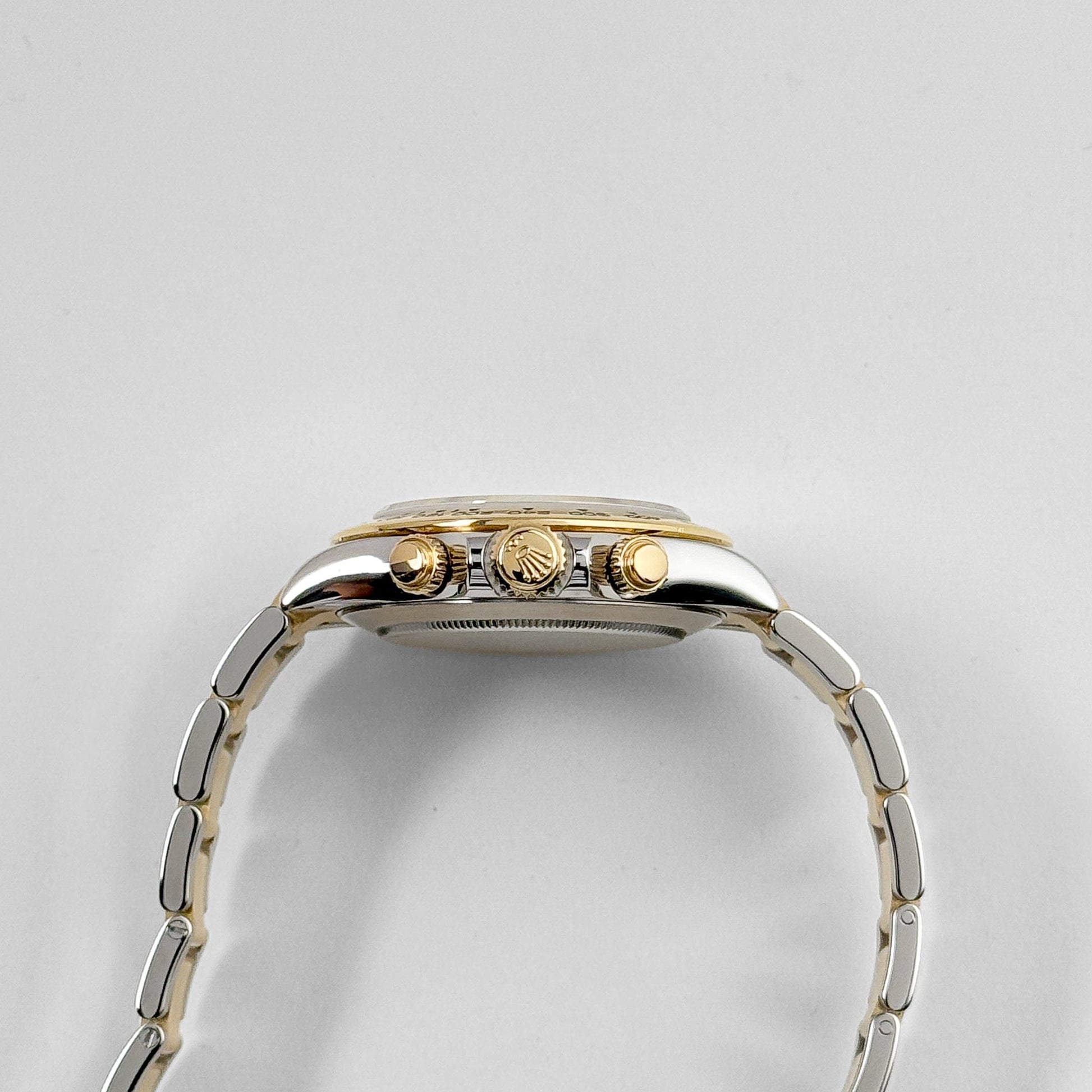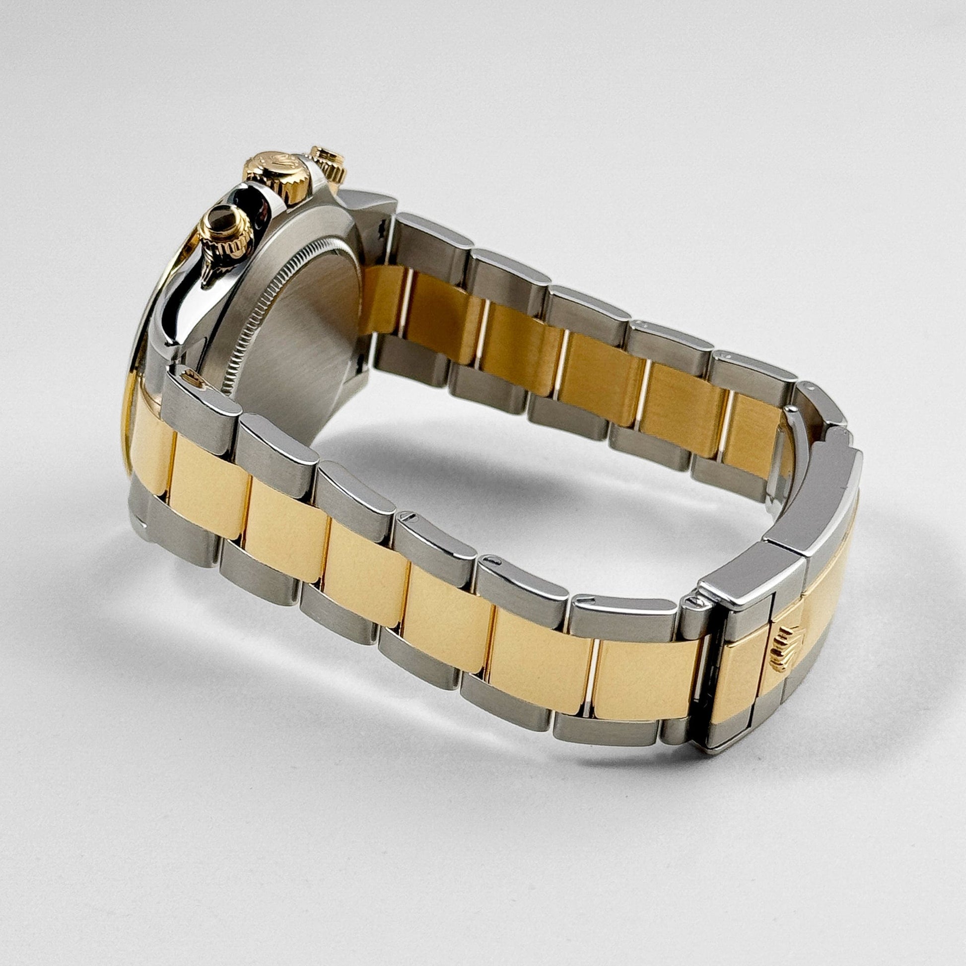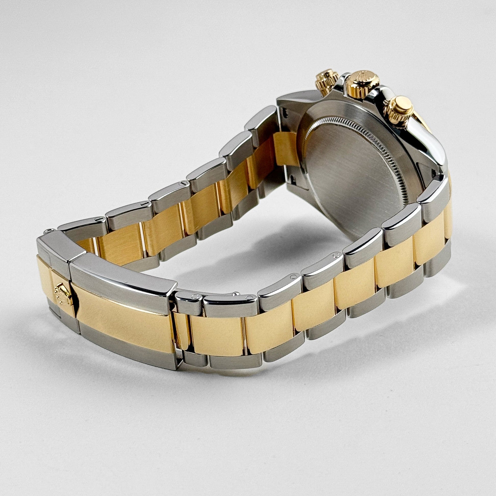 The tachymeter-engraved yellow gold bezel highlights its motorsport heritage, while the Oyster bracelet, composed of stainless steel with yellow gold center links, ensures both style and comfort. Equipped with a reliable chronograph function, the Daytona 116503 combines practical functionality with aesthetic appeal.