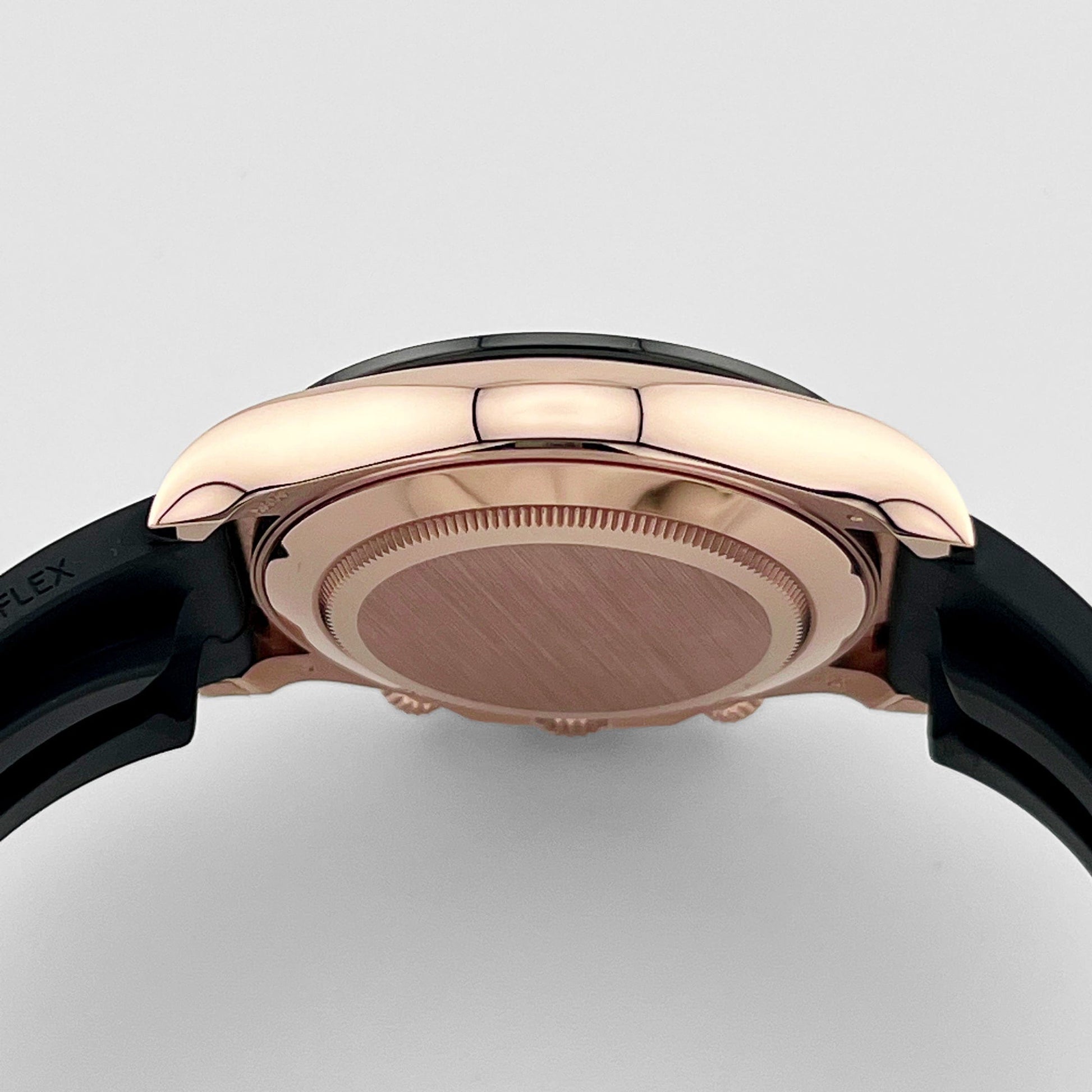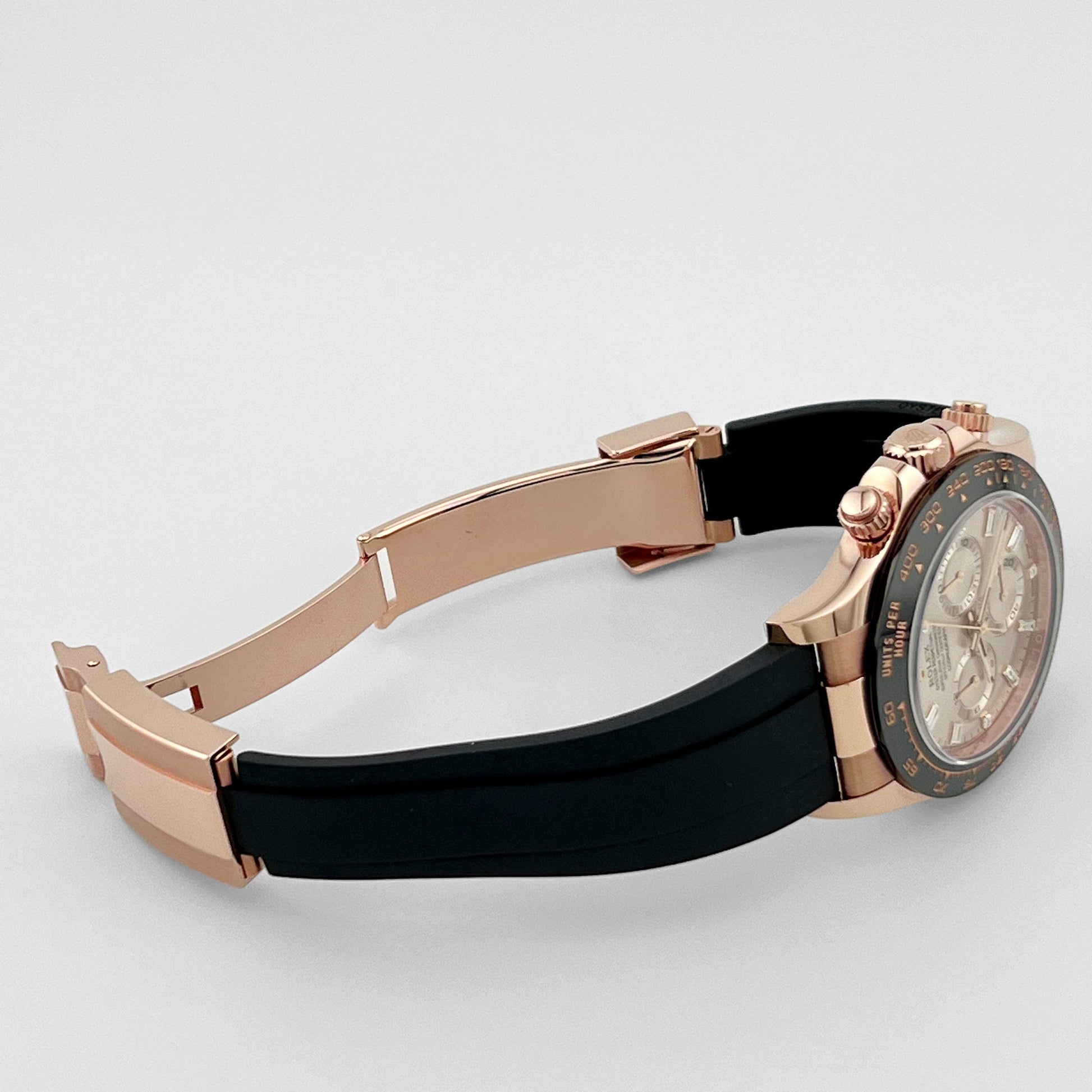 Powered by the Rolex Caliber 4130, this Daytona ensures precise timekeeping and reliable chronograph functionality, with a robust 72-hour power reserve. The watch is paired with a black Oysterflex bracelet, which blends the comfort of an elastomer strap with the durability of a metal core. The combination of Everose gold, diamond markers, and sophisticated performance makes the 116515LN a standout choice for collectors and connoisseurs who appreciate both luxury and precision.
