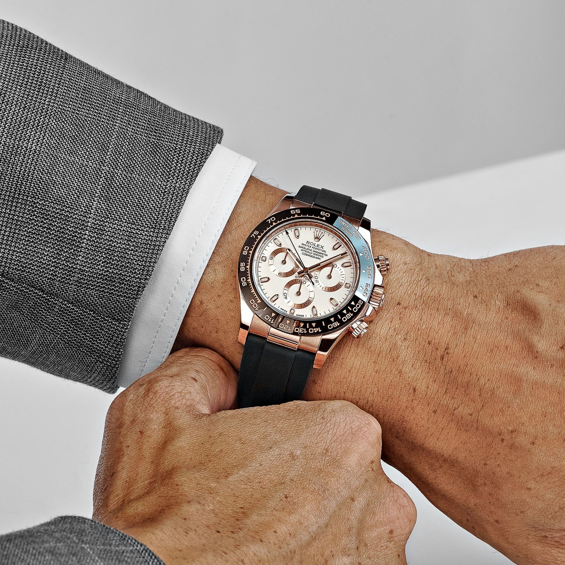 The ivory dial is elegantly accented with contrasting rose gold sub-dials, maintaining the Daytona’s signature chronograph layout. The Chromalight-filled hour markers and hands ensure readability in all lighting conditions. Completing the design is the sporty and comfortable black Oysterflex strap, combining the durability of elastomer with the refinement of a metal core.