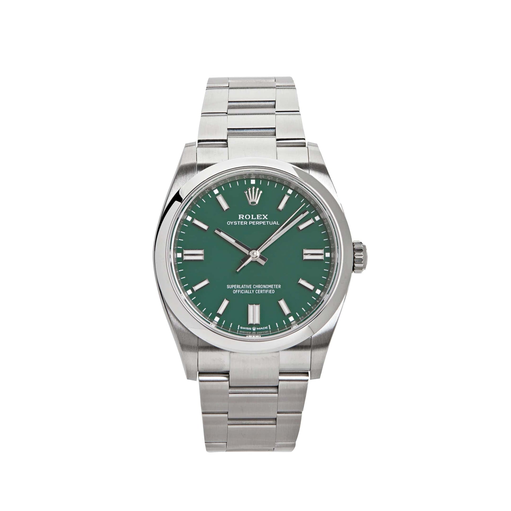 The Rolex Oyster Perpetual 126000 is a perfect blend of timeless design and modern appeal, crafted in stainless steel for a sleek and durable finish. Its 36mm case features a polished domed bezel, offering understated elegance and versatility. The vibrant green lacquered dial is the focal point, adding a bold yet sophisticated touch to this classic timepiece.