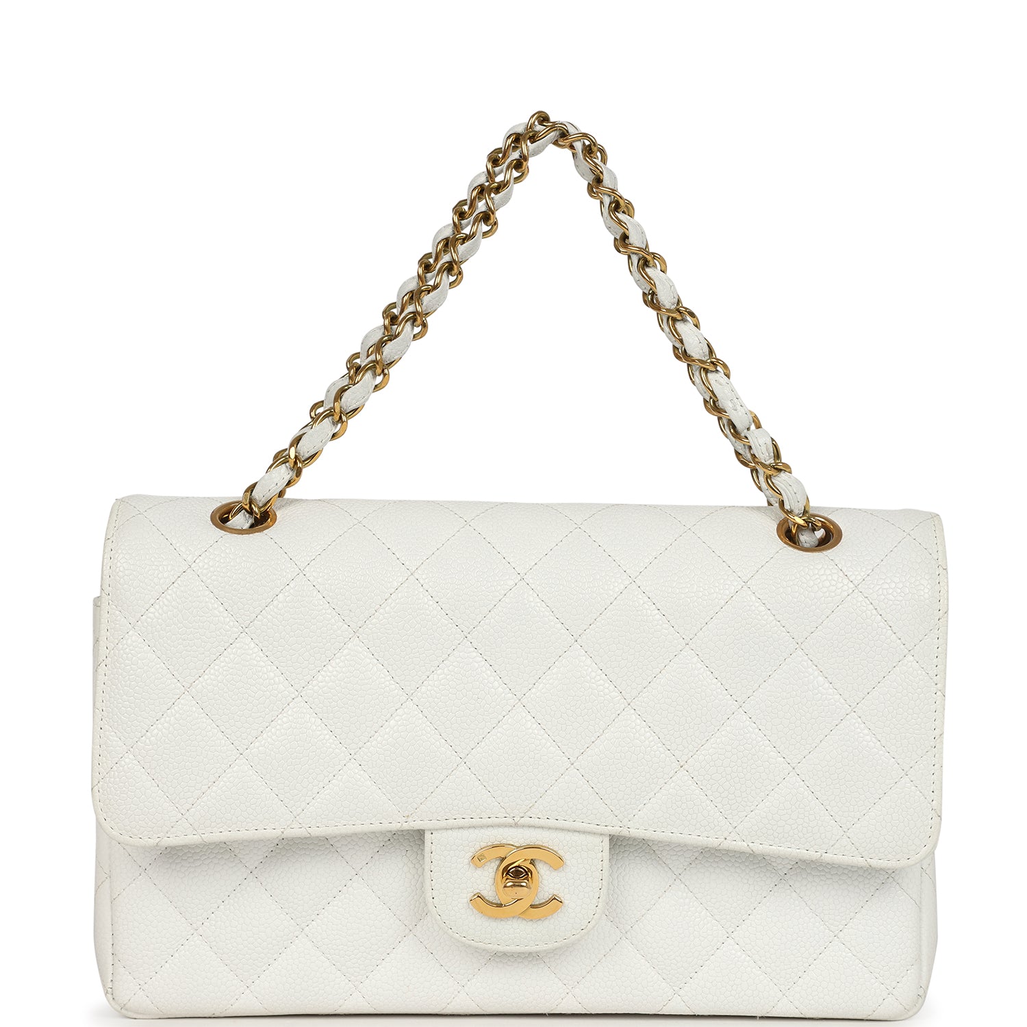 This vintage Chanel Medium Classic Double Flap Bag is in white caviar leather with gold hardware, front flap with CC turnlock closure, tonal stitching, half moon back pocket and an adjustable interwoven gold tone chain link and White leather shoulder/crossbody strap.